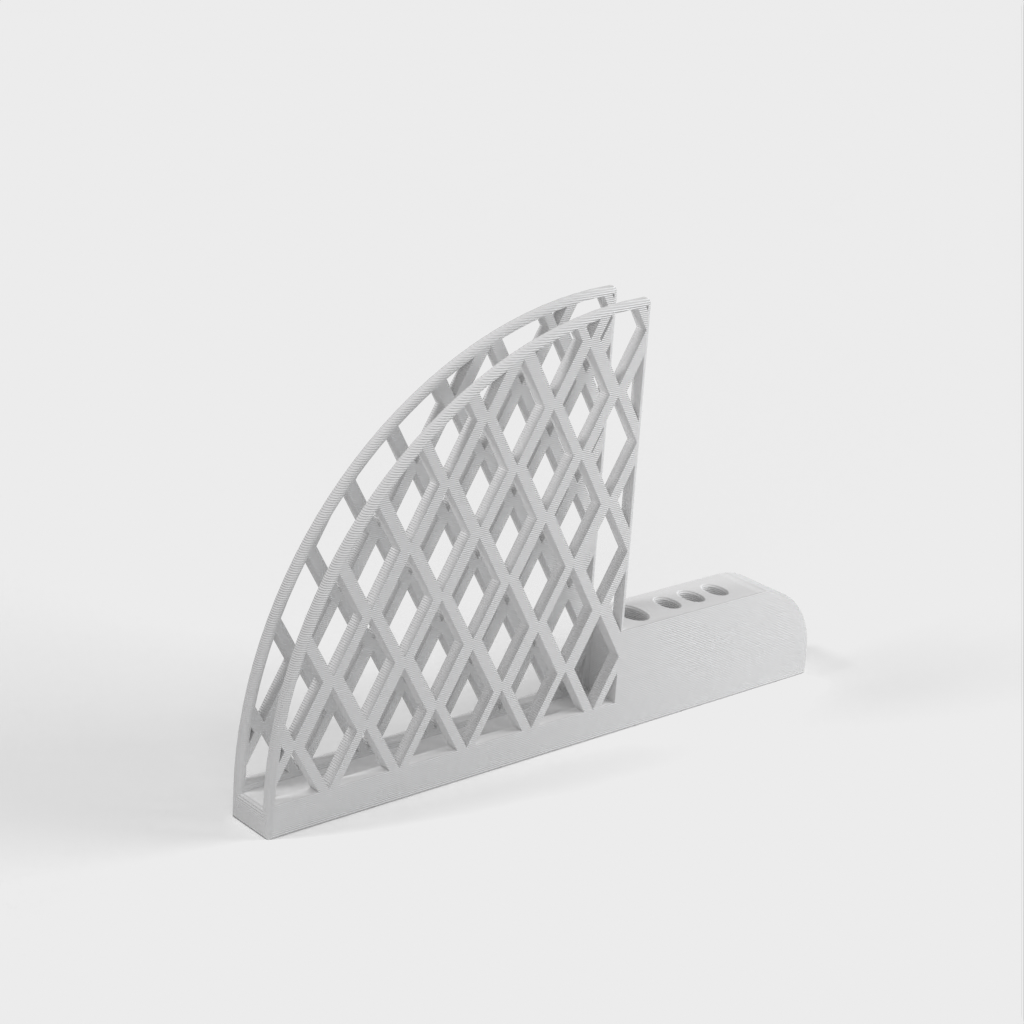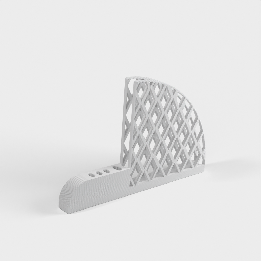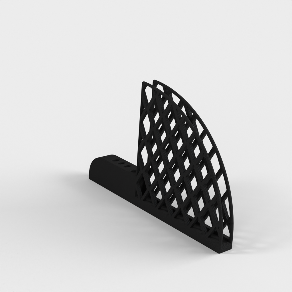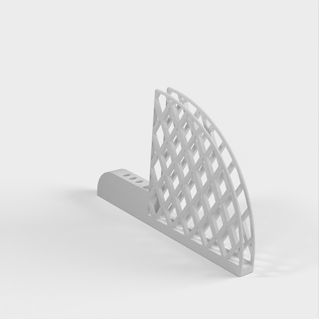 Porta filtro e cucchiaino per caffè progettato per i filtri Hario V60. Ha un grande foro per il cucchiaio per adattarsi a un manico ellittico da 5 mm x 10 mm e tre piccoli fori per adattarsi a un cucchiaio da 3 mm x 6 mm. Ogni foro ha un offset di 1 mm per adattarsi allo spazio. Il prodotto pesa 67 g e la stampa richiede circa 13 ore.
