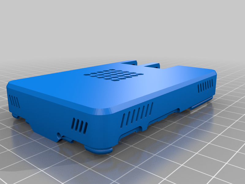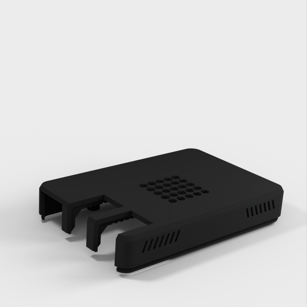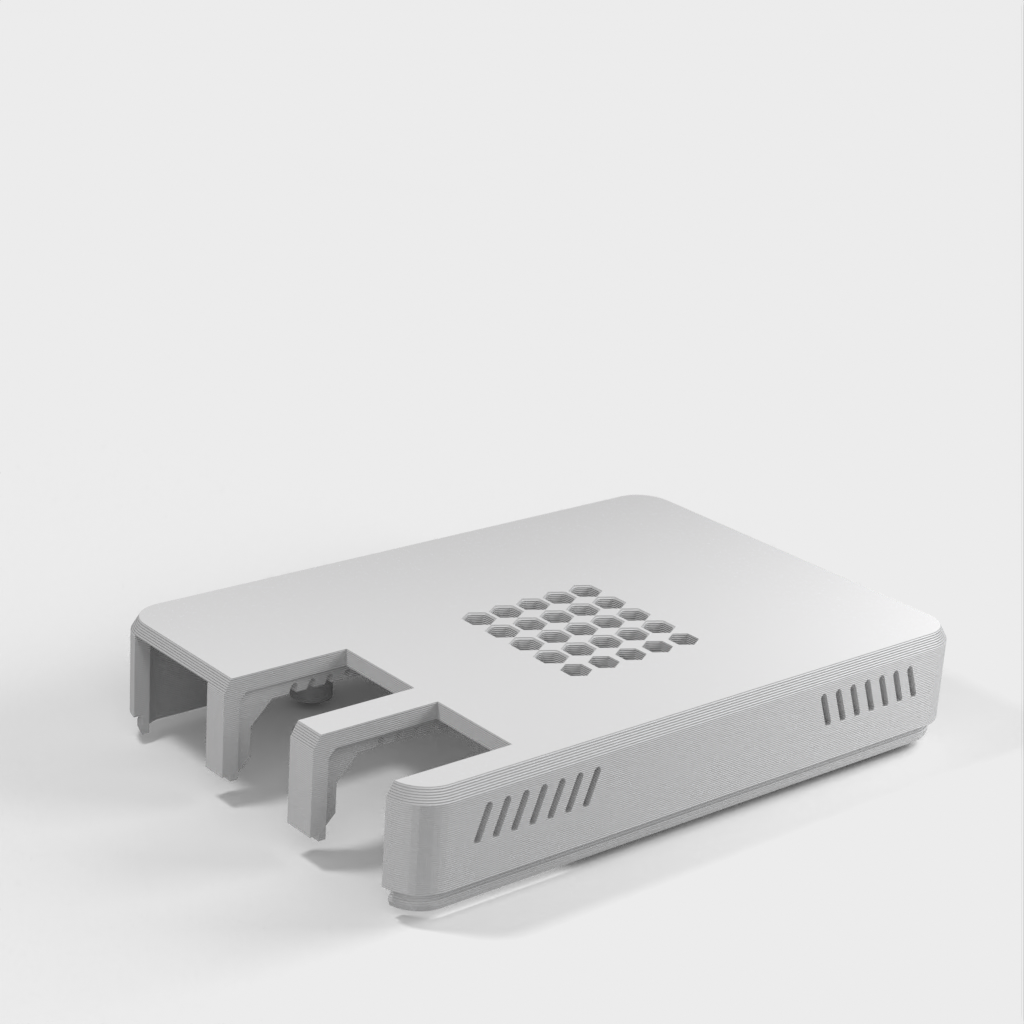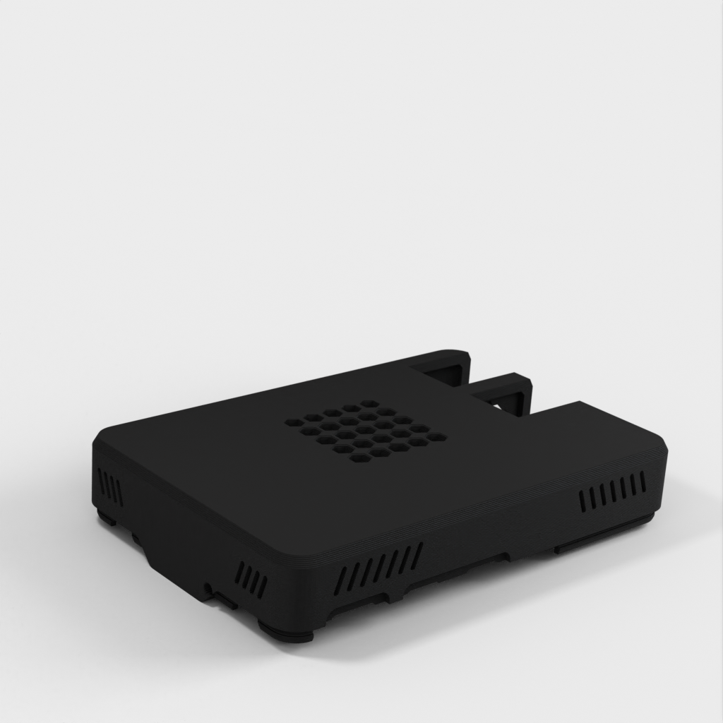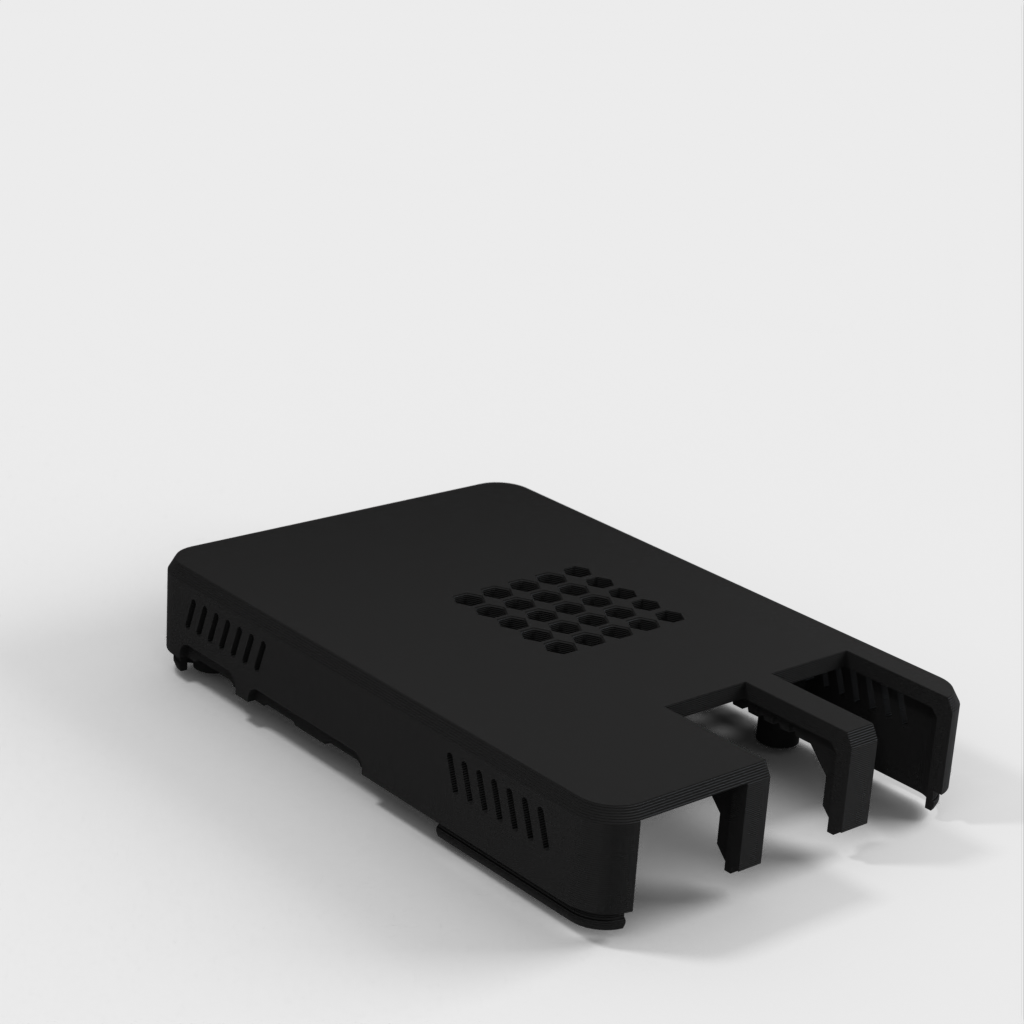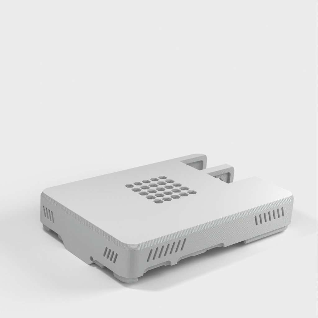 Custodia semplice per il Raspberry Pi 5 del 2023. Le modifiche includono il riposizionamento dei connettori USB e LAN, la rimozione del jack per le cuffie e l'aggiunta di una piccola apertura per il pulsante di reset. Sono stati aggiunti dei fori di ventilazione per adattarsi al radiatore originale.