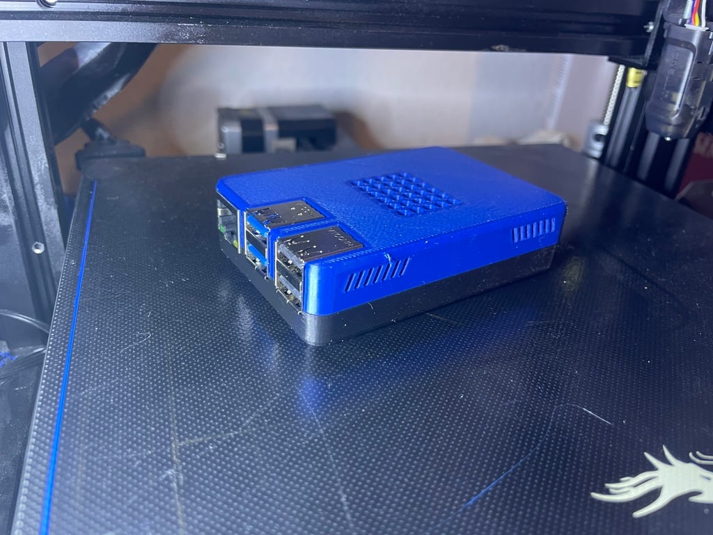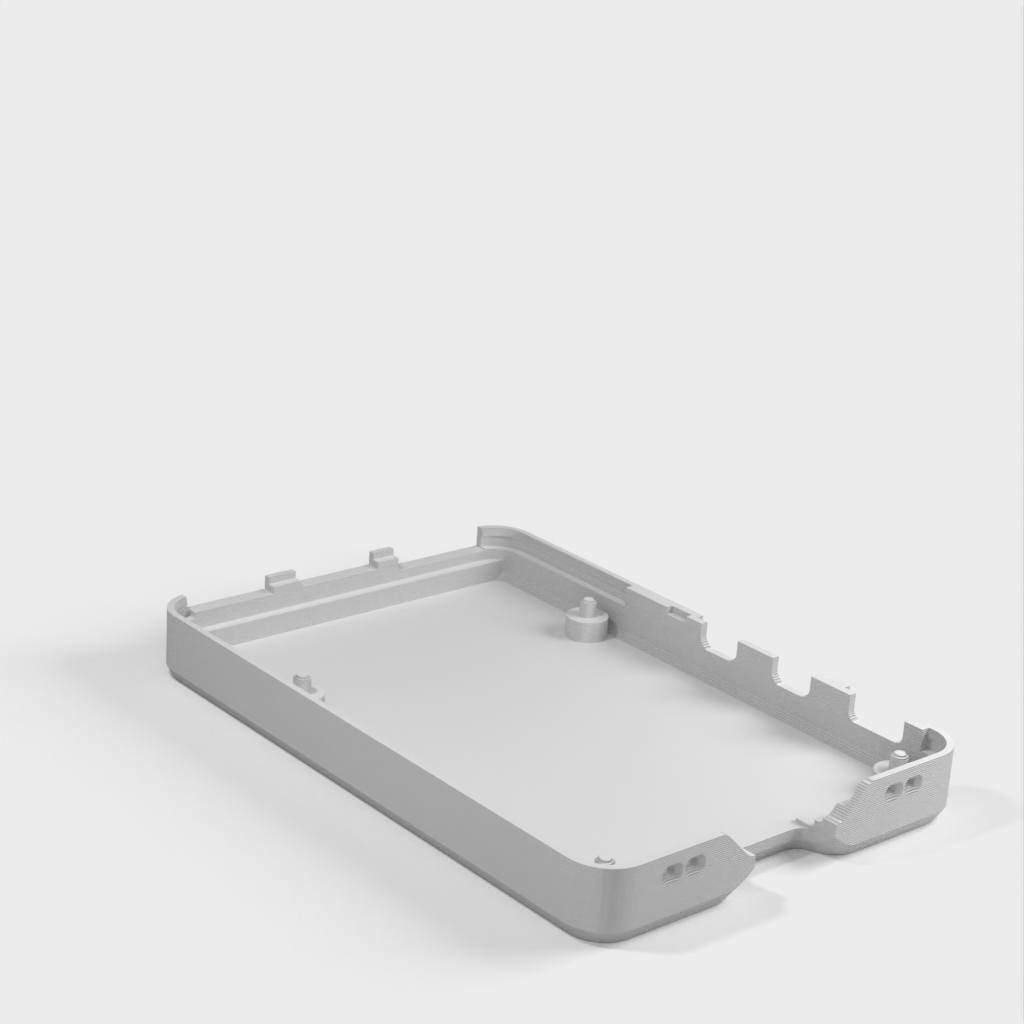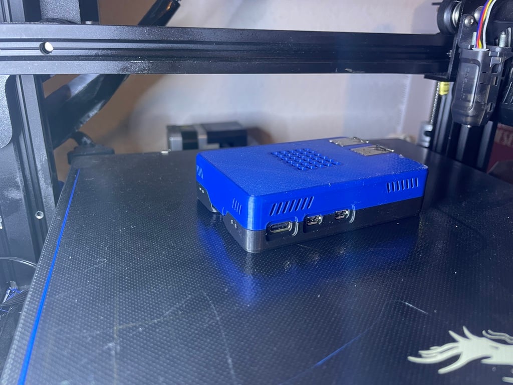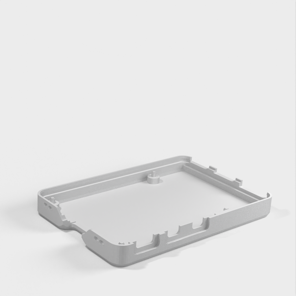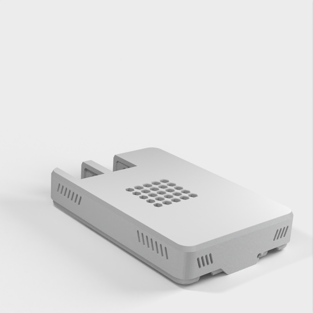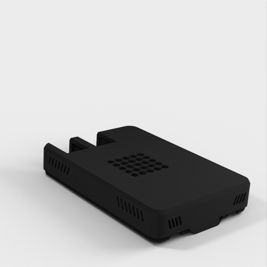 Custodia semplice per il Raspberry Pi 5 del 2023. Le modifiche includono il riposizionamento dei connettori USB e LAN, la rimozione del jack per le cuffie e l'aggiunta di una piccola apertura per il pulsante di reset. Sono stati aggiunti dei fori di ventilazione per adattarsi al radiatore originale.
