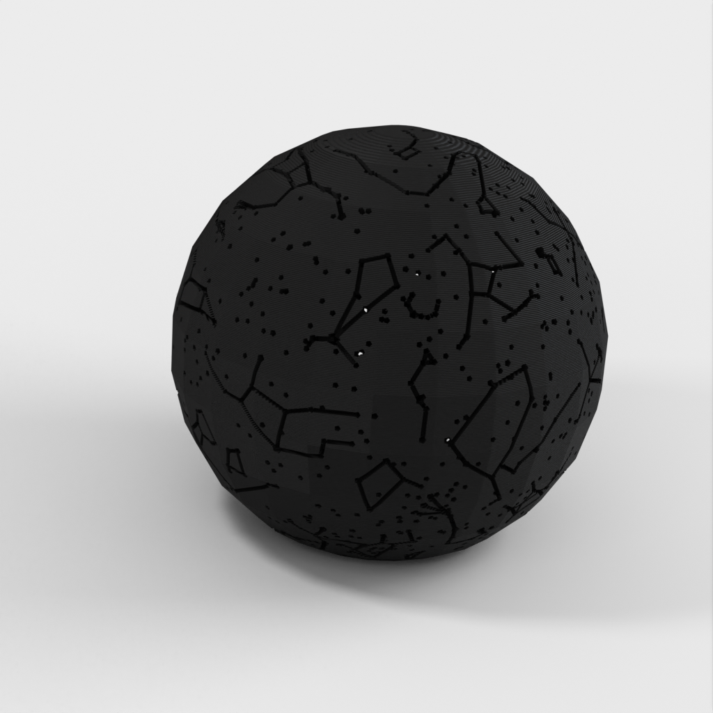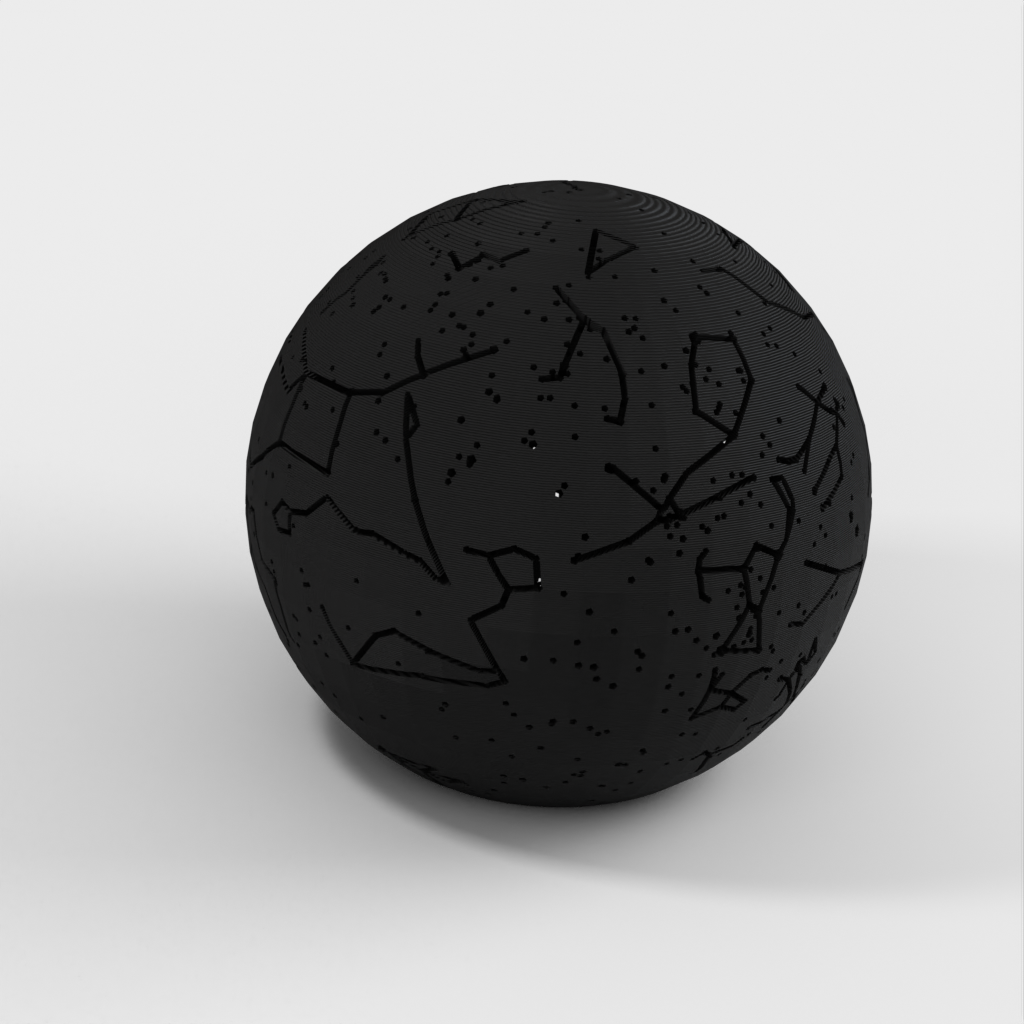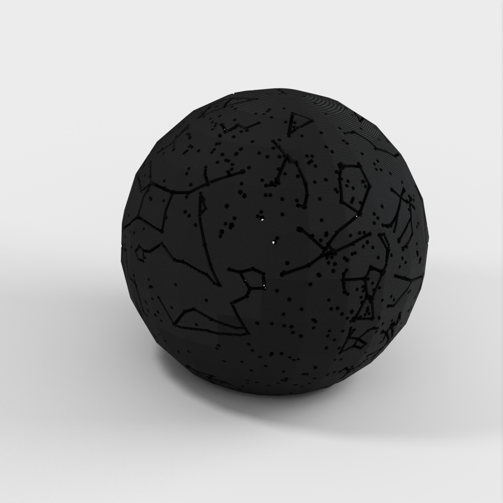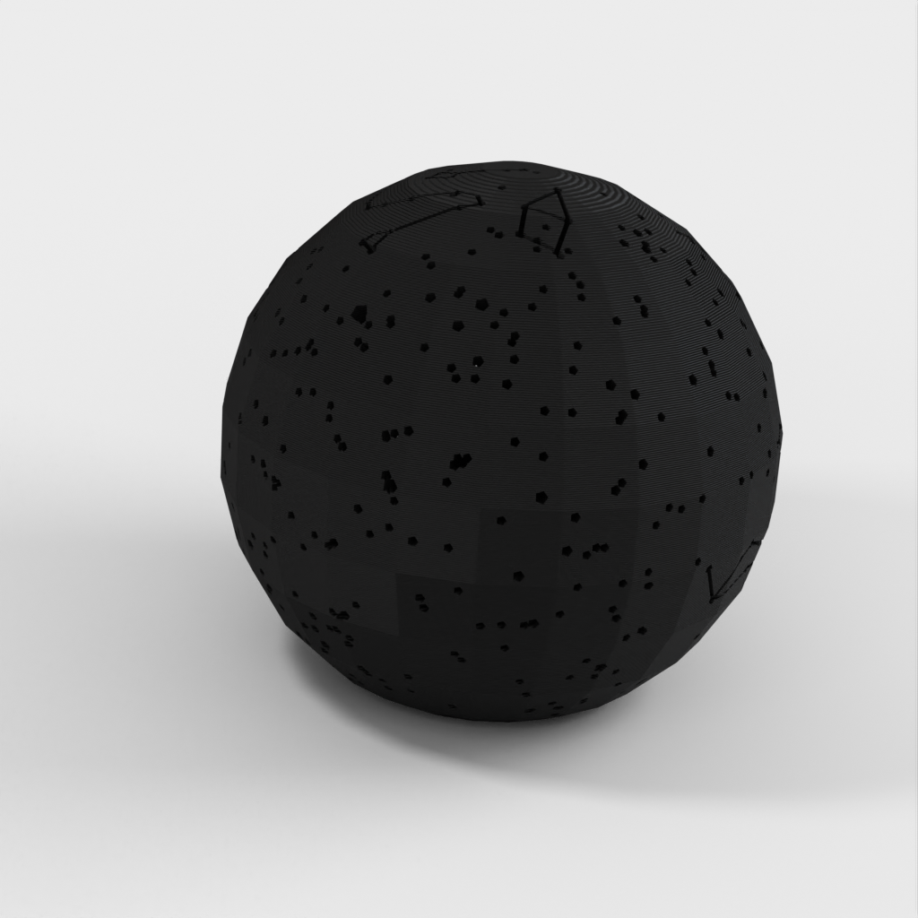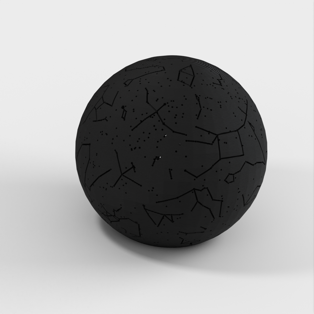 Questo prodotto è un'estensione dei modelli Celestial Sphere e può generare file STL per una sfera celeste. Con Openscad è possibile modificare molti parametri e produrre un modello 3D della sfera celeste, che può includere più di 1700 delle stelle più luminose e fino a 50 costellazioni. Il modello include anche i piani per una montatura di tipo equatoriale, completa di alimentazione per l'illuminazione a LED all'interno della sfera.