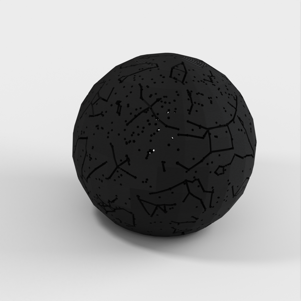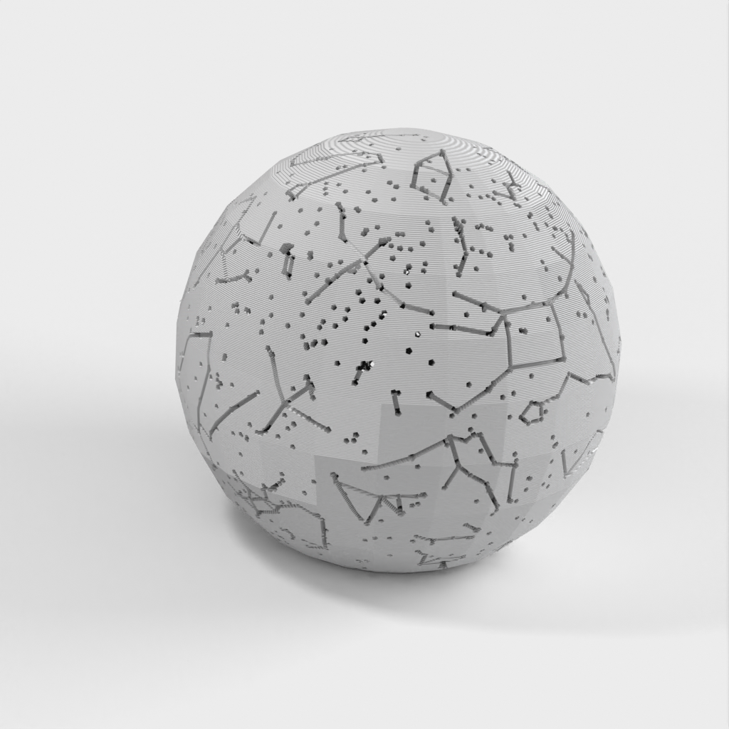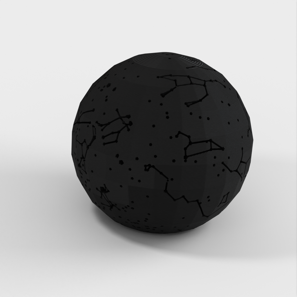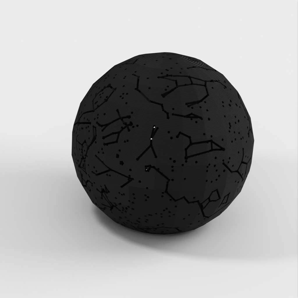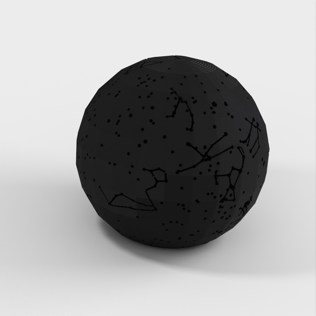 Questo prodotto è un'estensione dei modelli Celestial Sphere e può generare file STL per una sfera celeste. Con Openscad è possibile modificare molti parametri e produrre un modello 3D della sfera celeste, che può includere più di 1700 delle stelle più luminose e fino a 50 costellazioni. Il modello include anche i piani per una montatura di tipo equatoriale, completa di alimentazione per l'illuminazione a LED all'interno della sfera.
