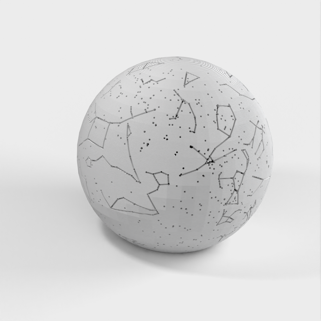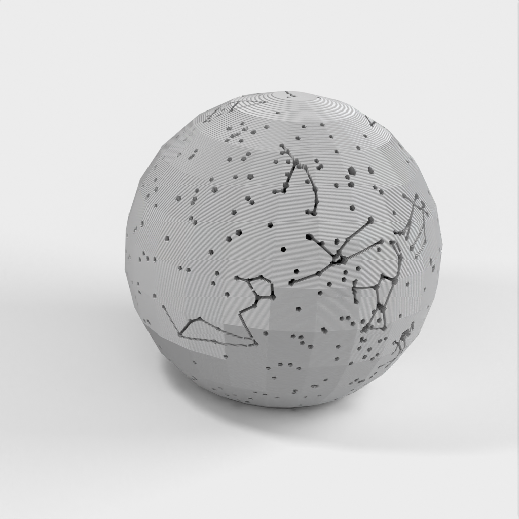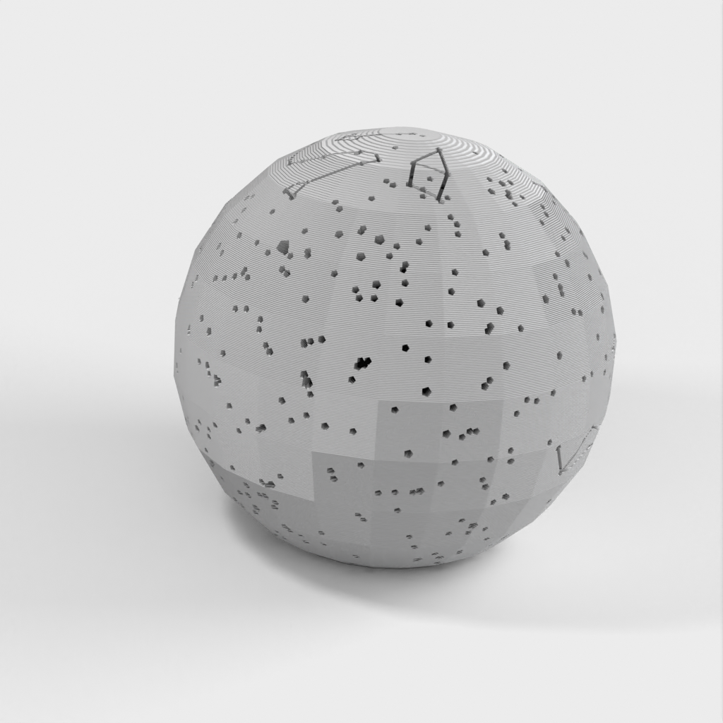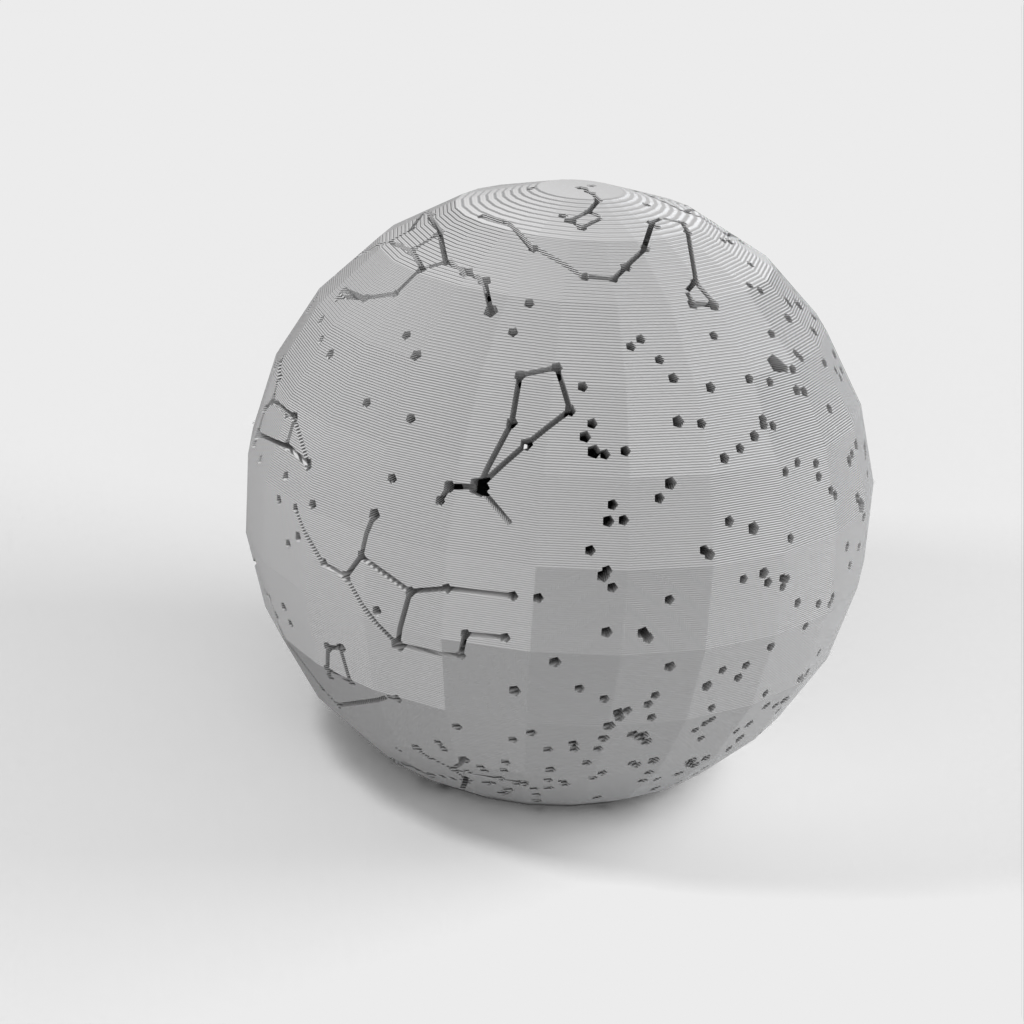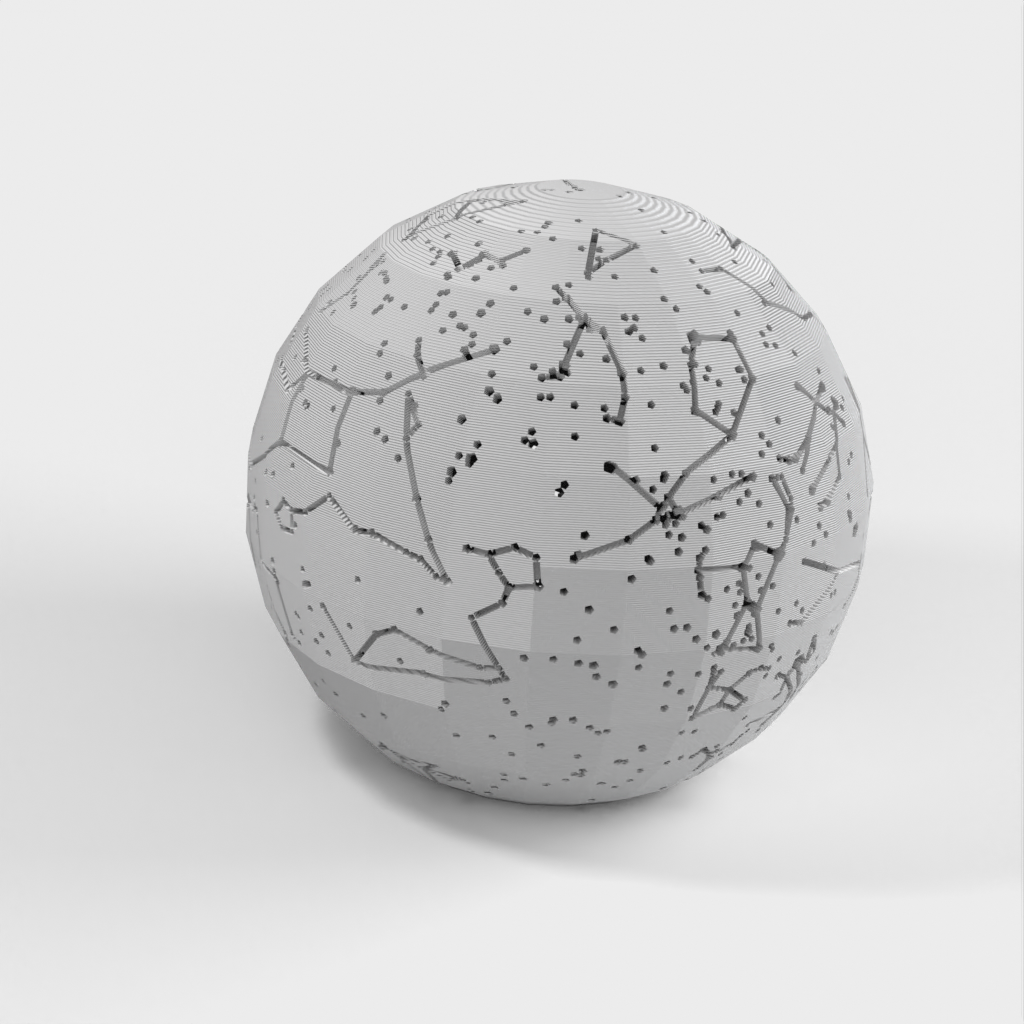 Questo prodotto è un'estensione dei modelli Celestial Sphere e può generare file STL per una sfera celeste. Con Openscad è possibile modificare molti parametri e produrre un modello 3D della sfera celeste, che può includere più di 1700 delle stelle più luminose e fino a 50 costellazioni. Il modello include anche i piani per una montatura di tipo equatoriale, completa di alimentazione per l'illuminazione a LED all'interno della sfera.