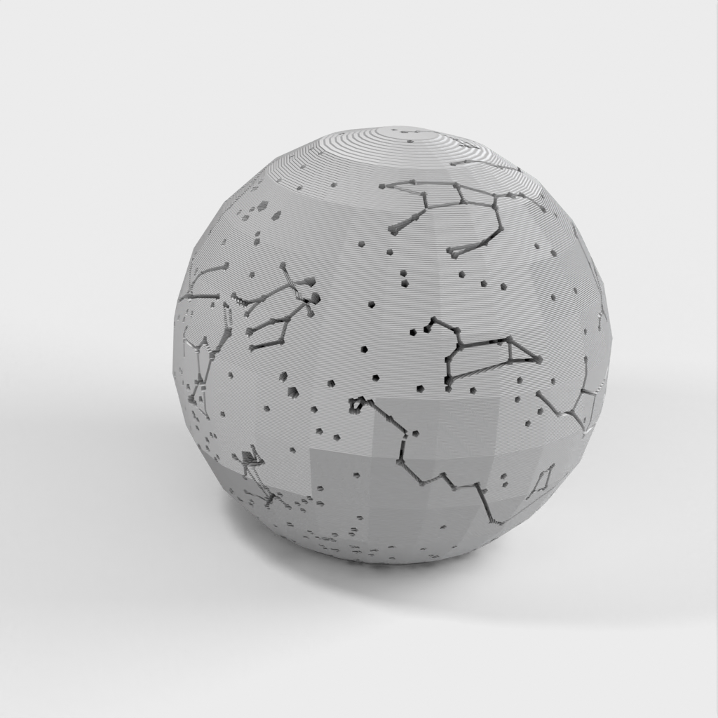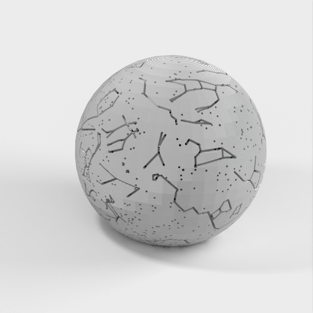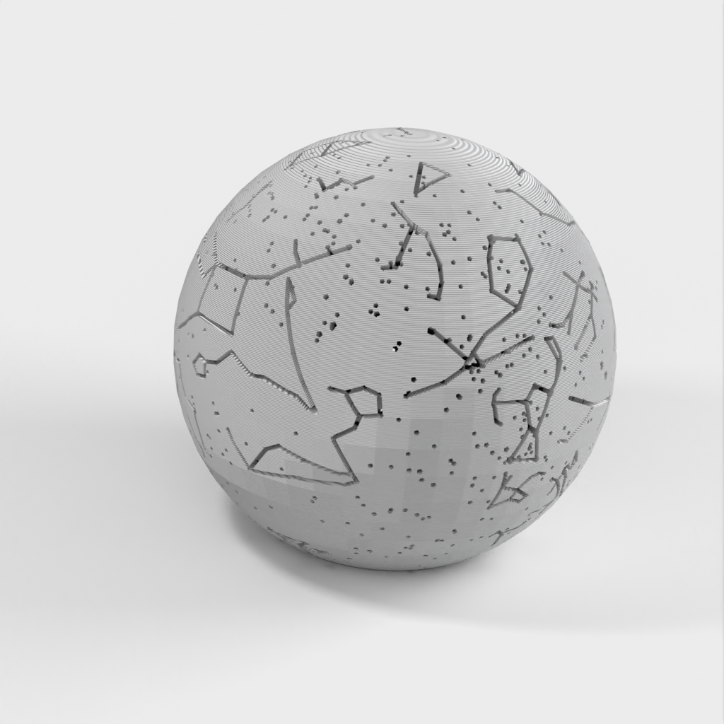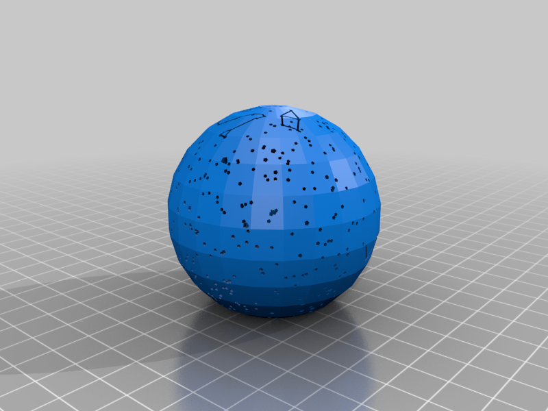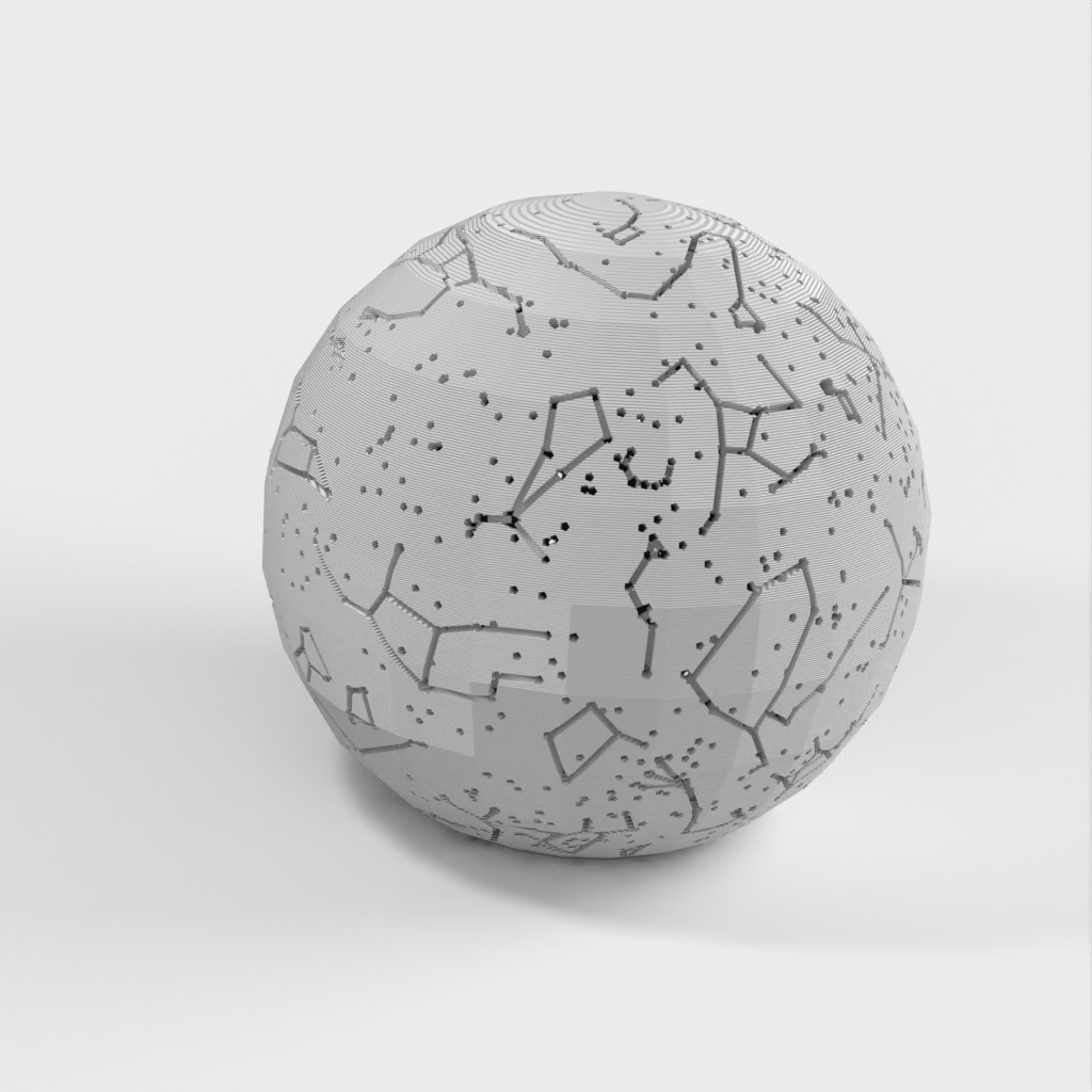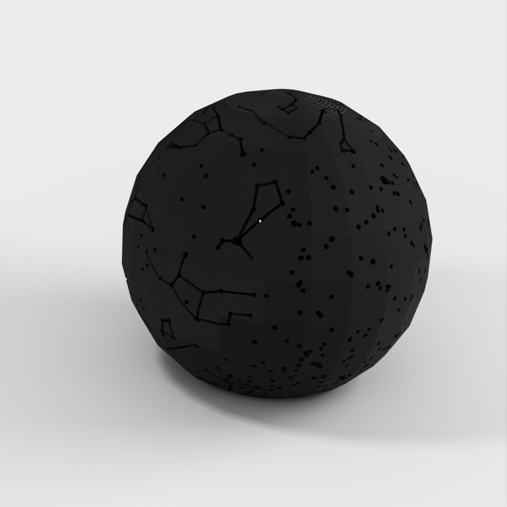 Questo prodotto è un'estensione dei modelli Celestial Sphere e può generare file STL per una sfera celeste. Con Openscad è possibile modificare molti parametri e produrre un modello 3D della sfera celeste, che può includere più di 1700 delle stelle più luminose e fino a 50 costellazioni. Il modello include anche i piani per una montatura di tipo equatoriale, completa di alimentazione per l'illuminazione a LED all'interno della sfera.