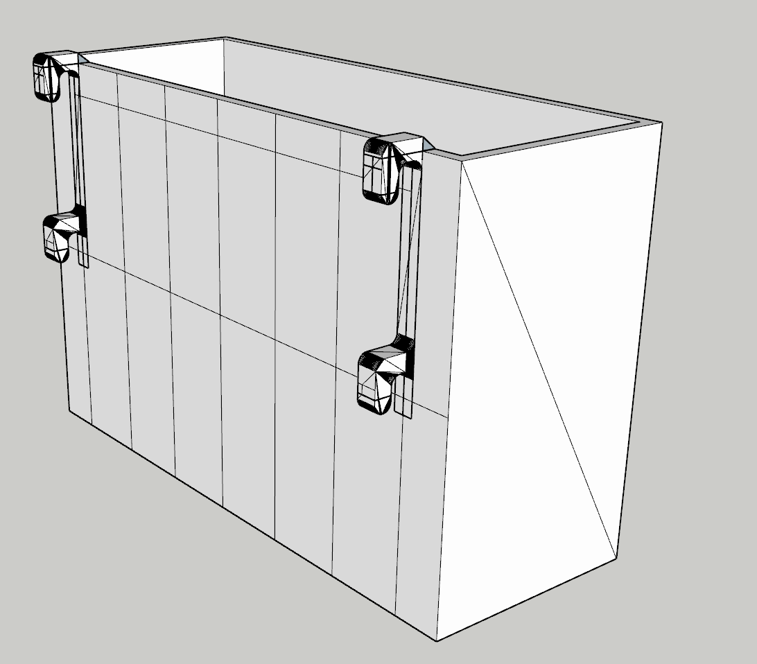 I ganci Easy SKADIS sono progettati per essere facilmente aggiunti alle scatole personalizzate. Hanno un design con un'ampia parte posteriore che si inserisce direttamente nel pannello, facilitando così l'aggiunta e la rimozione dal pannello, ma fornendo anche una forza sufficiente per tenere le penne in un cestino quando i denti del gancio sono leggermente estesi. Grazie a questo modello remix, i denti possono essere più lunghi, rendendo leggermente più difficile la rimozione del gancio dal pannello di chiodatura, ed è ora possibile aggiungere il design del gancio alle proprie scatole personalizzate. Per mantenere la corretta distanza verticale tra i due ganci piccoli, è stato lasciato un rettangolo 1D tra di essi che non viene stampato.