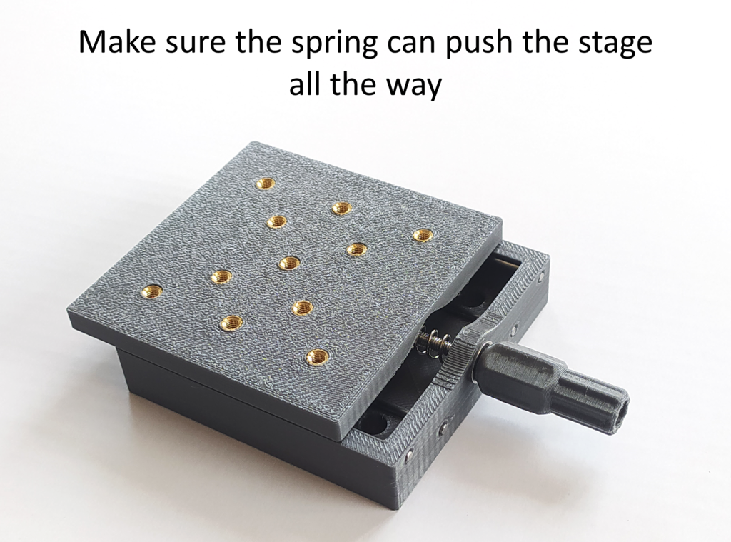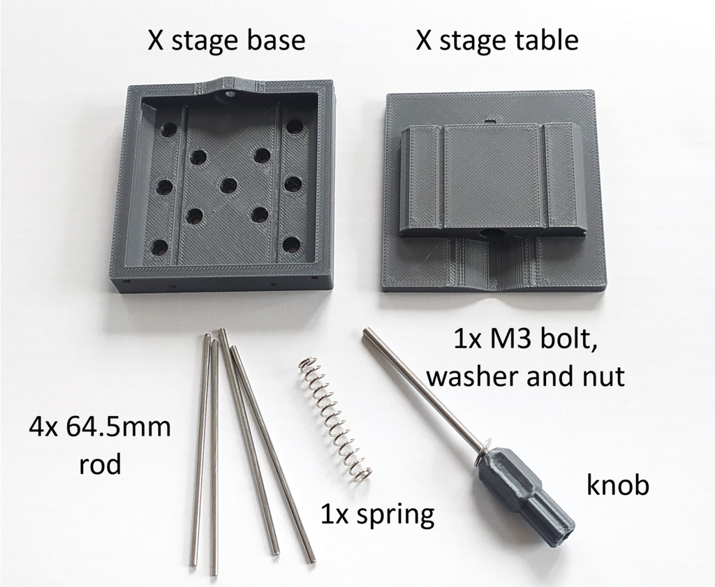Il tavolo lineare stampato è una soluzione pratica per il posizionamento di precisione con un'accuratezza fino a 10 micron. Il design è ideale per progetti in cui i movimenti precisi sono fondamentali. Utilizza parti stampate in 3D insieme a barre di metallo da 2 mm, una molla da 40 mm e un bullone M3 da 55 mm con dado e controdado per garantire stabilità e funzionalità.