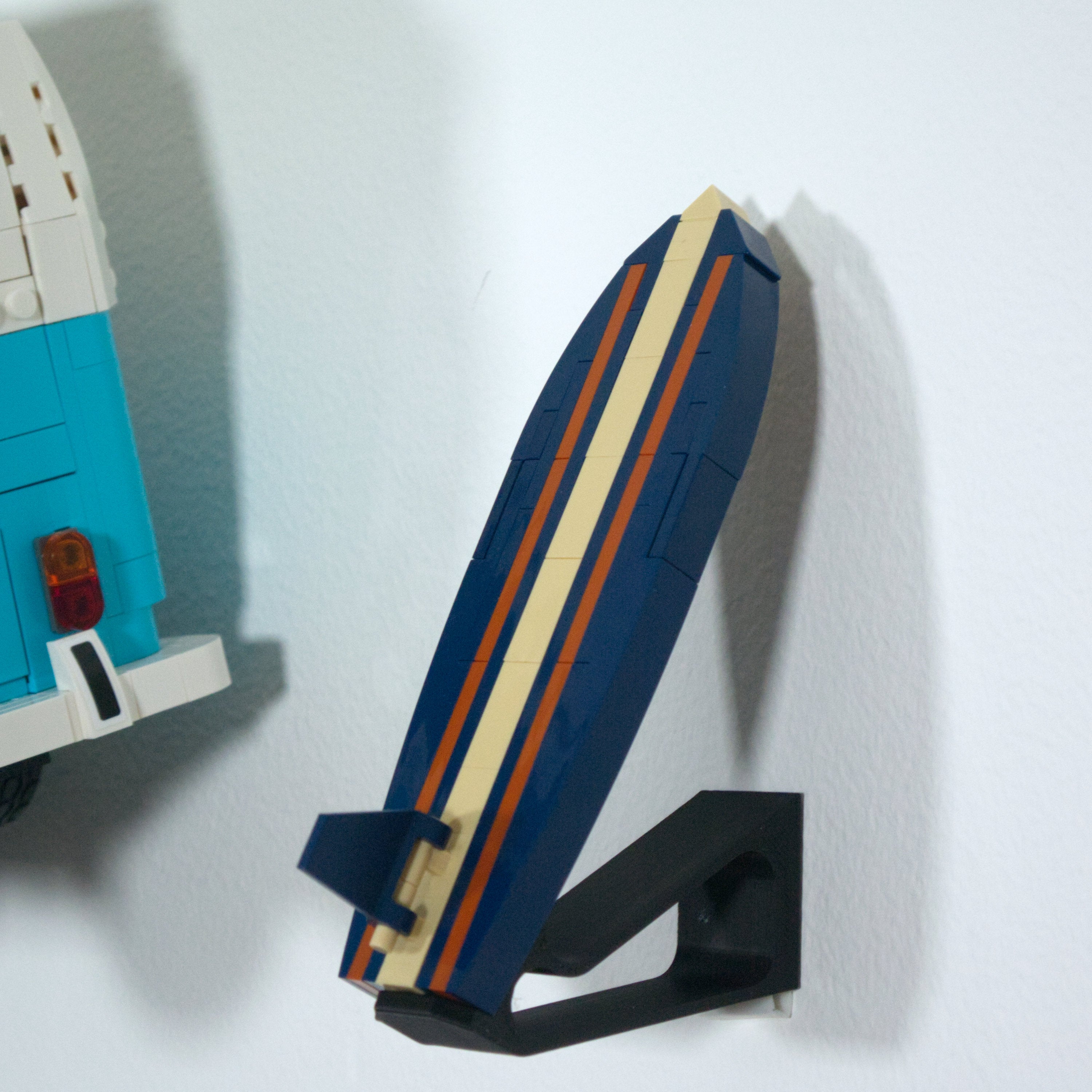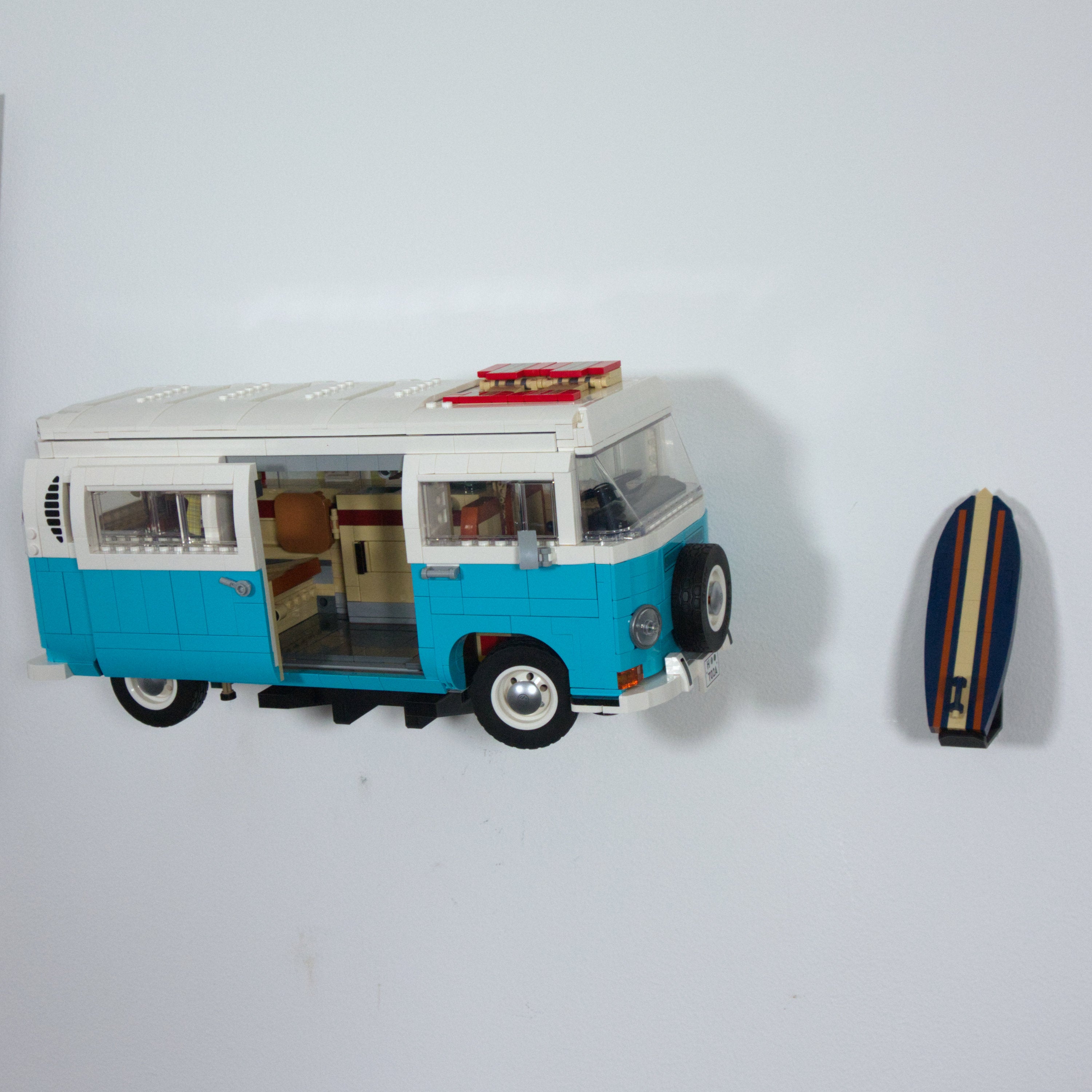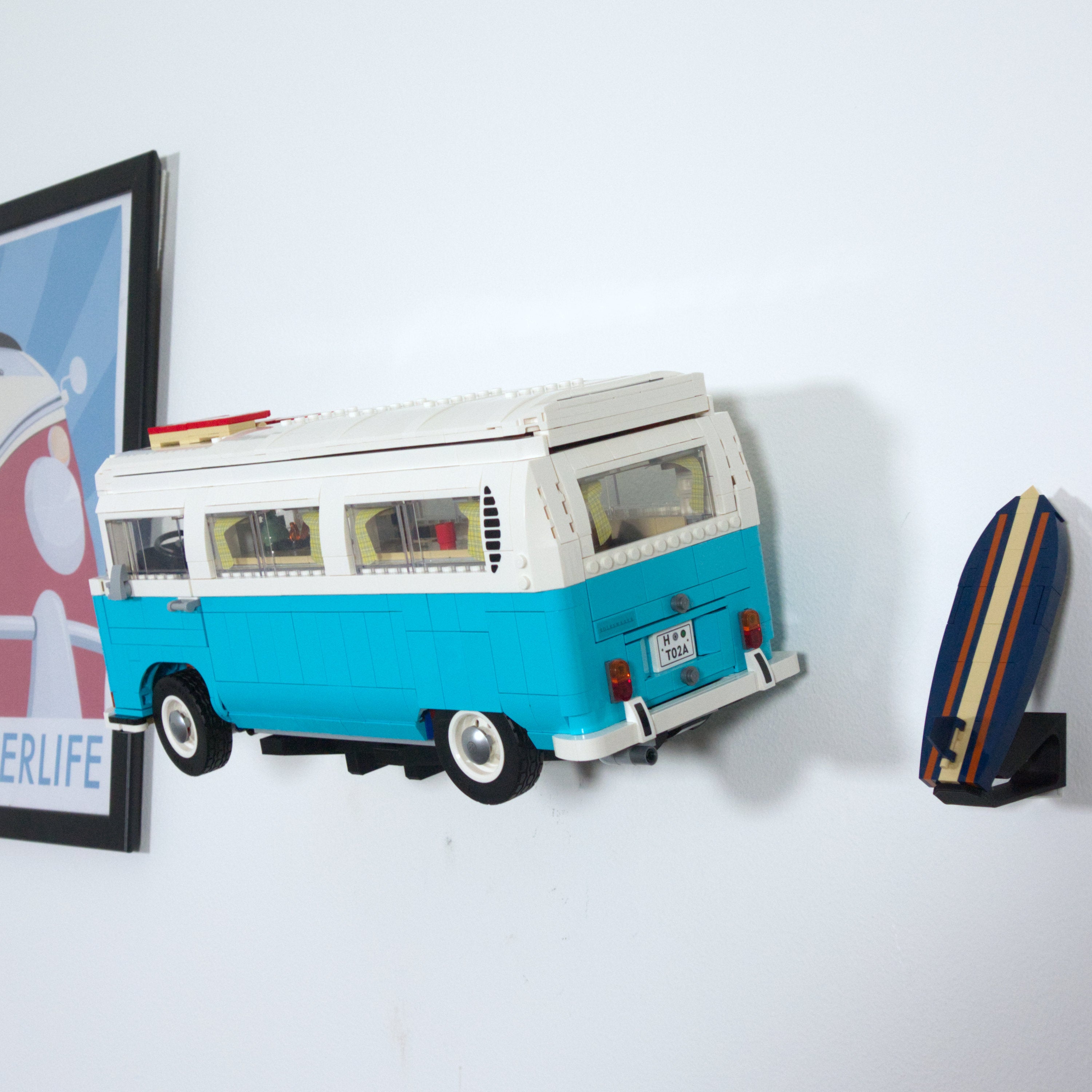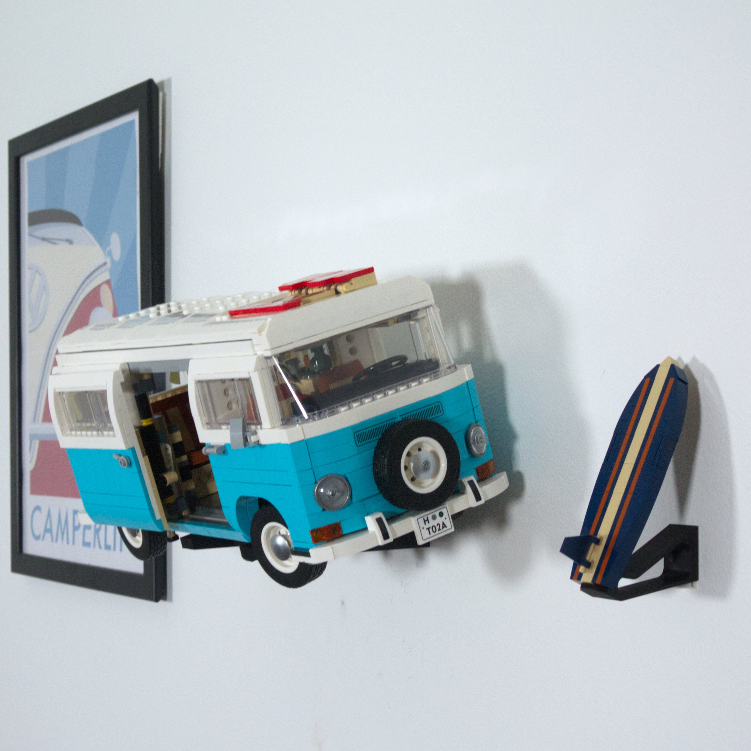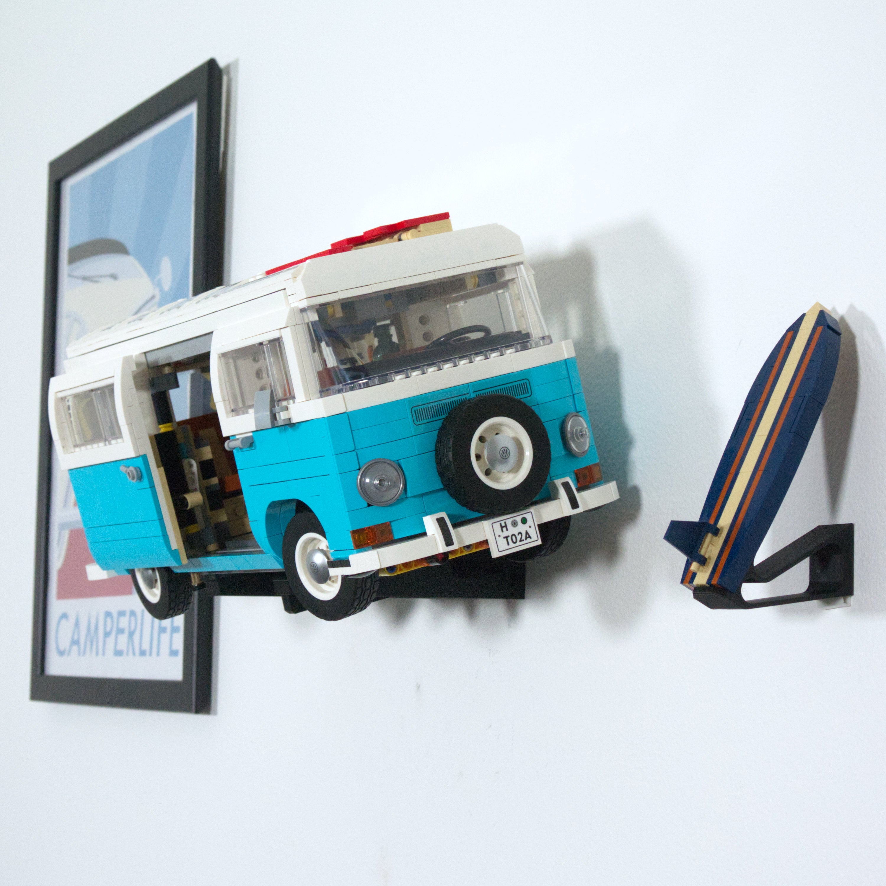 Questa staffa da parete ti permette di esporre orizzontalmente il tuo LEGO VW Camper Van sulla parete. È compatibile con i modelli T1 e T2 e consente una facile rimozione del veicolo. È inclusa una staffa separata per la tavola da surf e la staffa principale si monta facilmente con una singola vite.