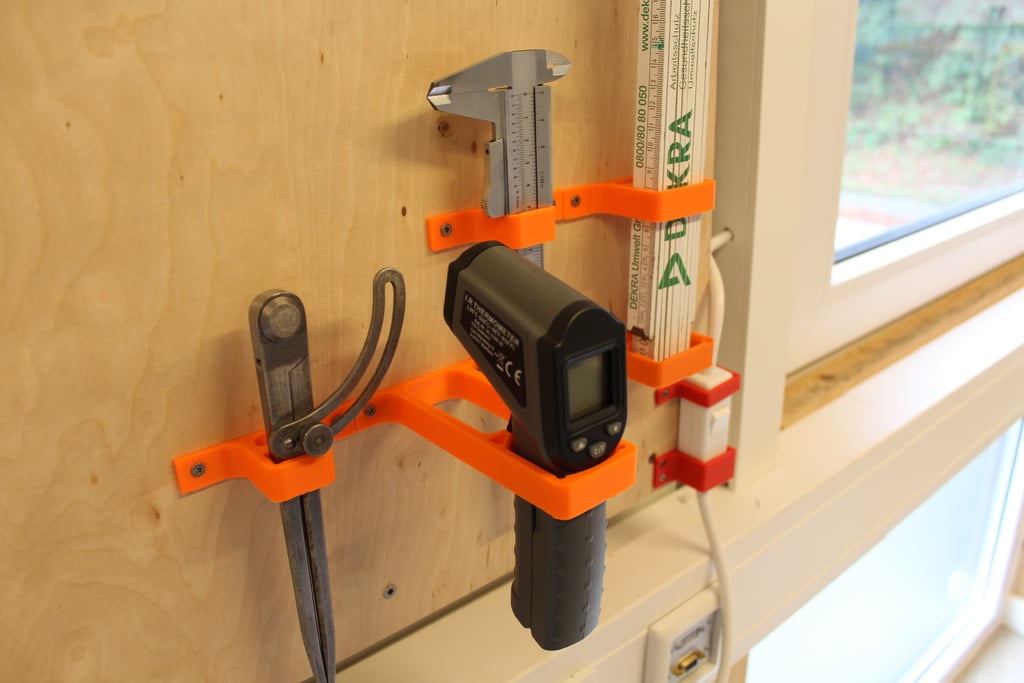 Come parte integrante del sistema "Parete degli strumenti Ideenreich", questo supporto a parete supporta un'organizzazione efficace dei tuoi strumenti in officine, FabLab e makerspace. Una parete organizzata riduce i tempi persi e aumenta la produttività mantenendo a portata di mano strumenti importanti come il termometro a infrarossi.