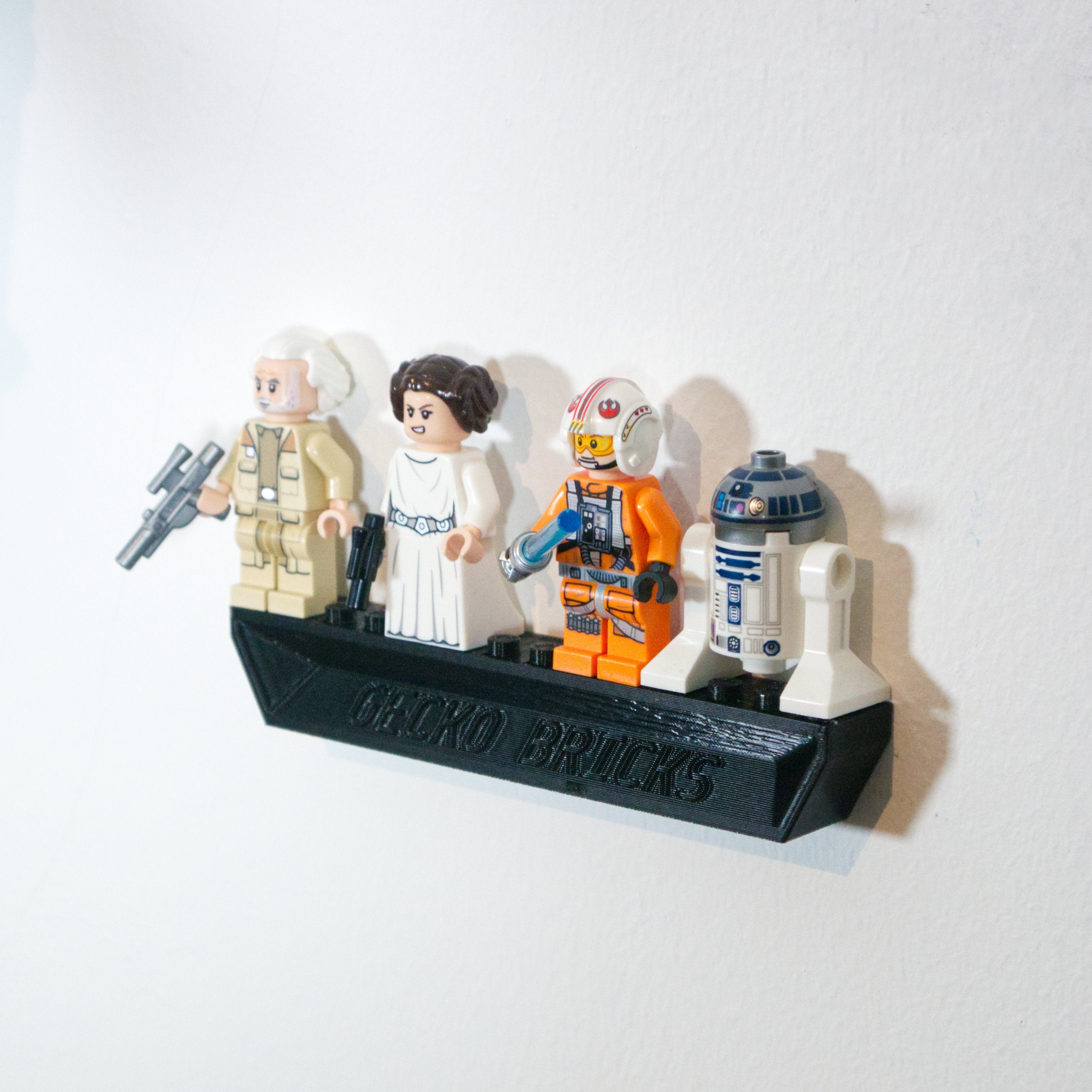 Questa staffa da parete è specificamente progettata per esporre il caccia X-Wing di Luke Skywalker 75301 di LEGO Star Wars. Con gli adattatori inclusi, il modello può essere appeso angolato o piatto lungo la parete verso destra o sinistra. È inclusa anche un supporto separato per esporre ordinatamente le tue minifigure accanto.
