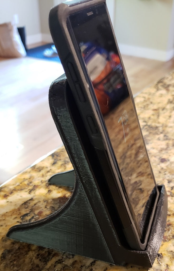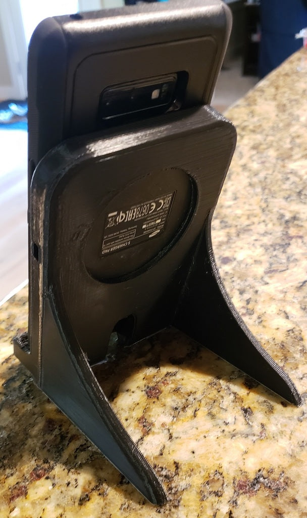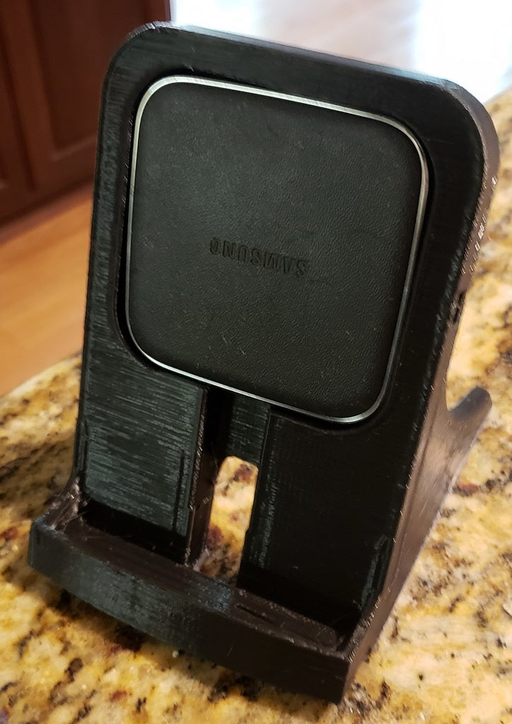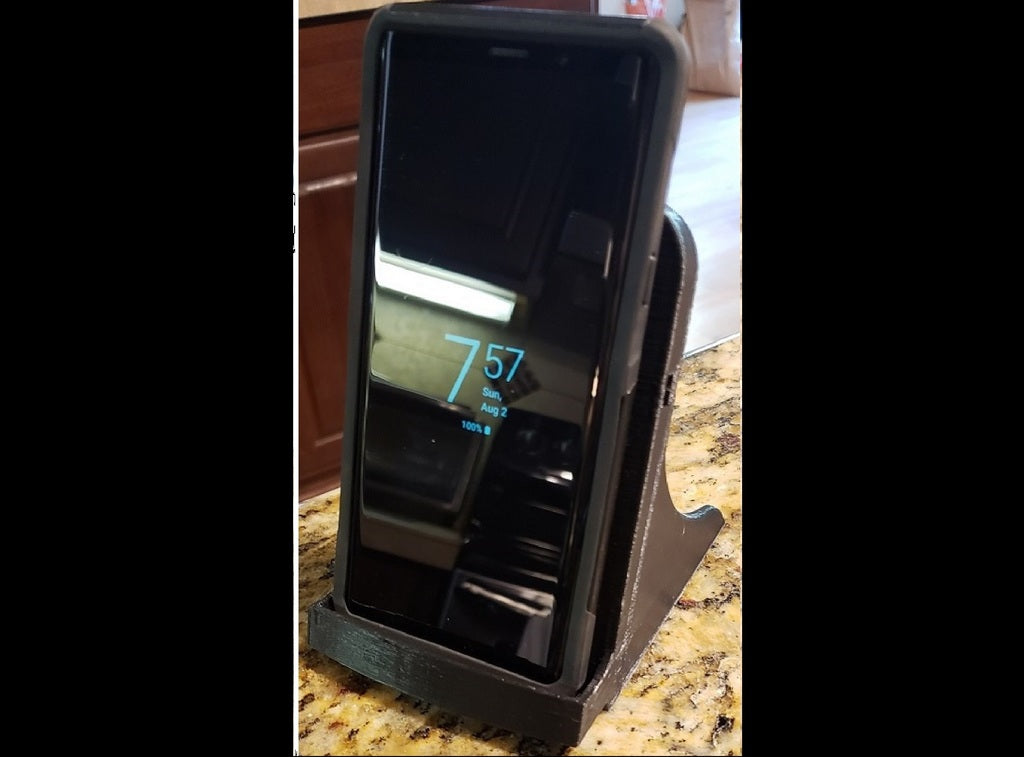 Questo è un supporto per caricabatterie per Samsung Galaxy Note 9, progettato per adattarsi a un caricatore quadrato Samsung EP-PG900IBE. È stato appositamente regolato per accogliere il telefono quando è ancora nella robusta custodia Otterbox. Il foro dell'altoparlante è stato riposizionato correttamente nella parte inferiore e il caricabatterie è stato rialzato per funzionare con la posizione di ricarica wireless interna del Note. L'intero dispositivo è leggermente più ingombrante e richiede circa 3,5 ore di stampa a una velocità di 80 mm/s con un'altezza di 0,3 strati e un riempimento del 20%.
