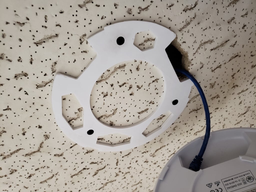 Questa è una piastra di montaggio per Ubiquiti Unifi UAP AC Pro. Presenta fori di montaggio a vite e alcune aperture. Questa piastra rende facile fissare il tuo Ubiquiti Unifi UAP AC Pro alla superficie desiderata.