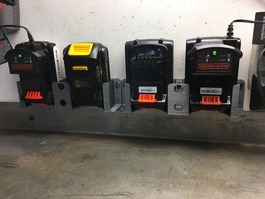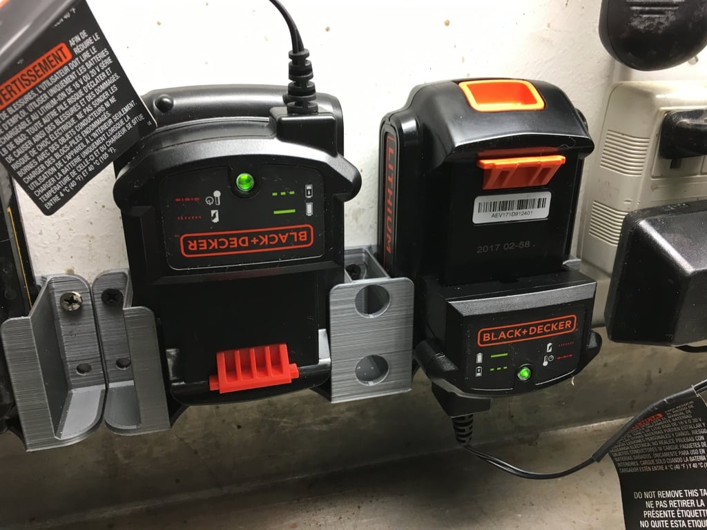 Portabatterie singolo e doppio per batterie Black & Decker / DeWalt 20V. Può essere montato a parete o in posizione verticale. Le batterie Black & Decker 20V sono utilizzate per le macchine da giardino. Le batterie DeWalt 20V sono utilizzate per i normali utensili elettrici DeWalt