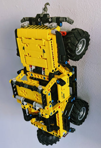 Supporto da parete per Lego Technic modello 42122 Jeep Wrangler. Questa staffa è progettata per montare il modello Lego Jeep Wrangler in modo sicuro sulla parete. Come mostrato nell'immagine, il gancio si collega alla parte inferiore del modello su entrambi i lati del manubrio.