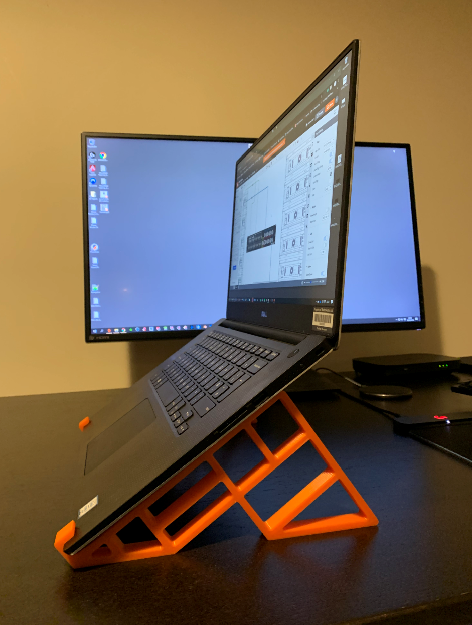 Supporto per laptop Dell XPS 15. Il supporto solleva lo schermo a circa 170 mm e lo posiziona all'angolo perfetto per una posizione piatta dello schermo quando è completamente sospeso. Il supporto si adatta perfettamente al letto MK3 ed è stampato con SUNLU PETG. Richiede circa 9 ore di stampa e utilizza 3 circonferenze con un angolo di riempimento di 55 gradi e Gyroid Infill del 15%.