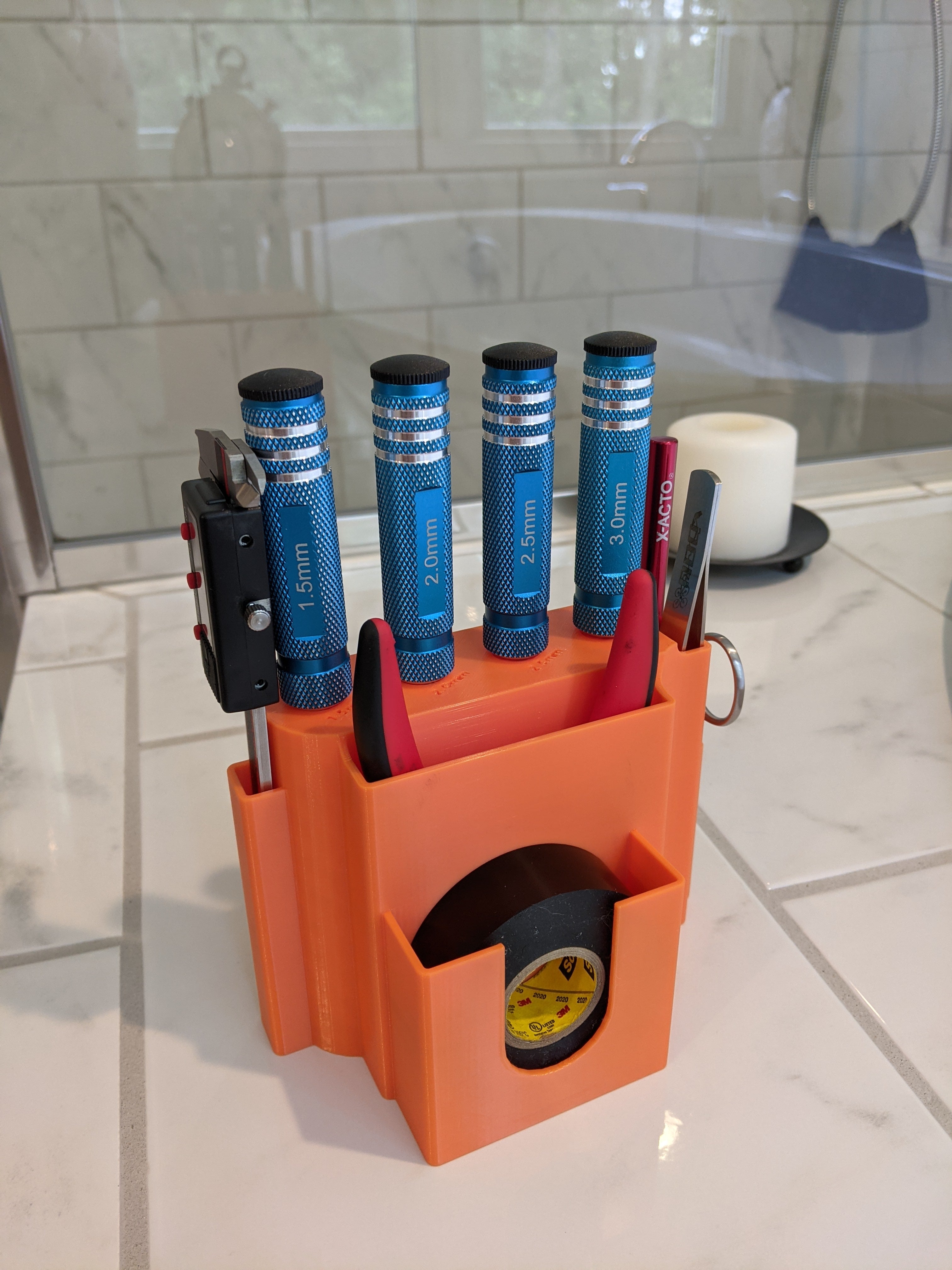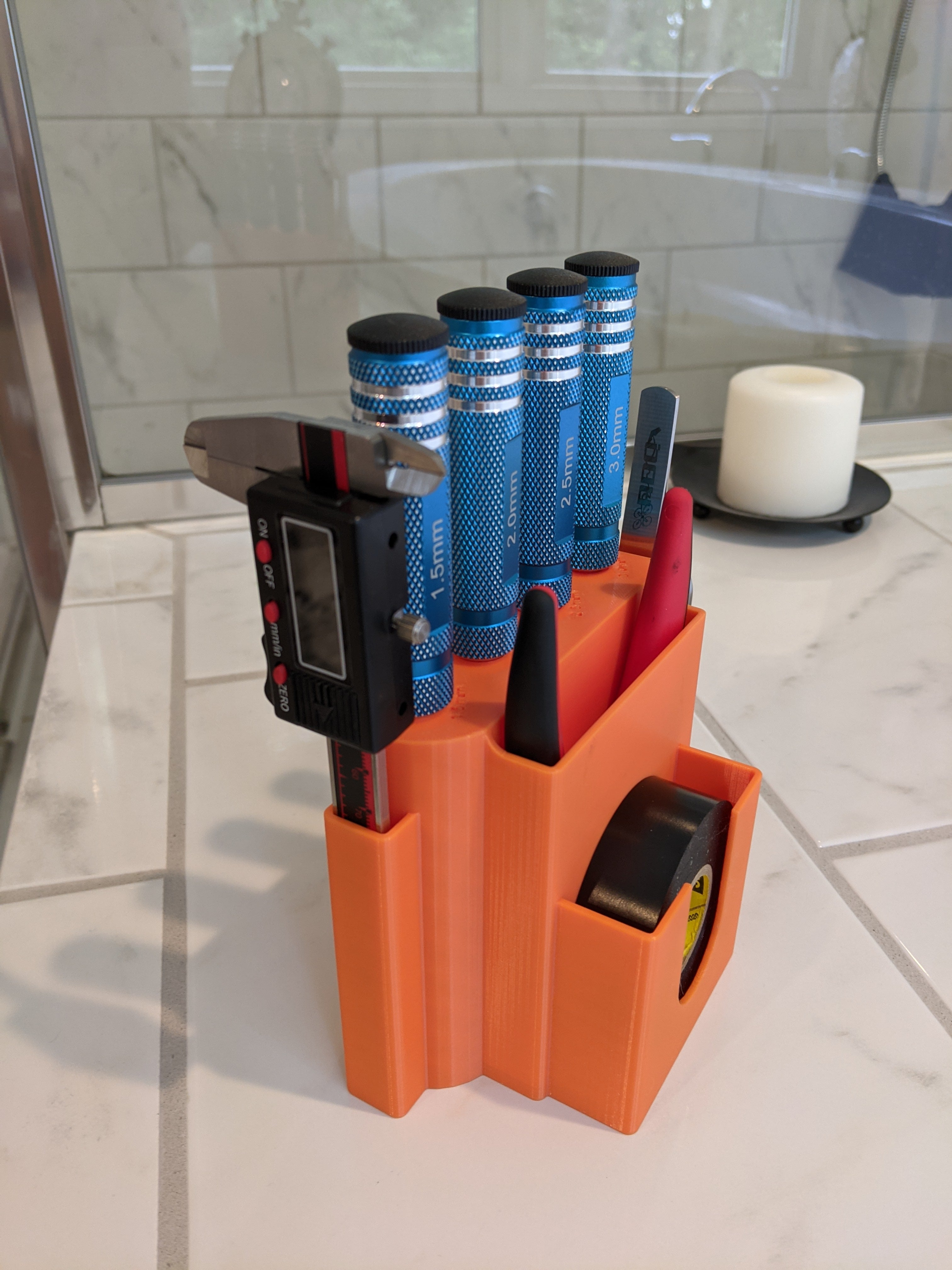 Un pratico organizzatore di strumenti da tavolo progettato per contenere tutti gli strumenti quotidiani per la costruzione e la riparazione di droni FPV e la stampa 3D. Questo organizzatore riduce in modo significativo i tempi di costruzione e riparazione tenendo a portata di mano gli strumenti più necessari. È realizzato con PLA arancione Hatchbox per garantire durata e consistenza.