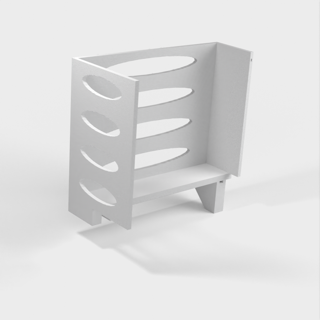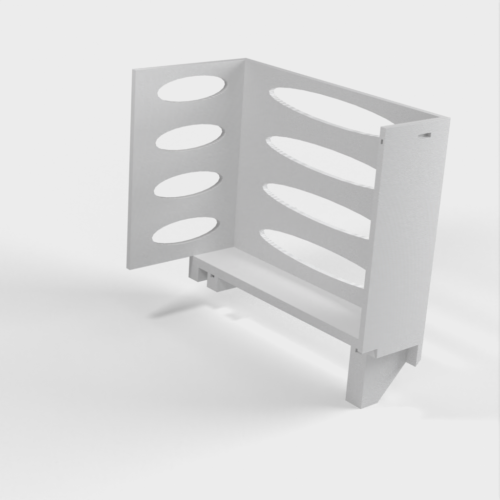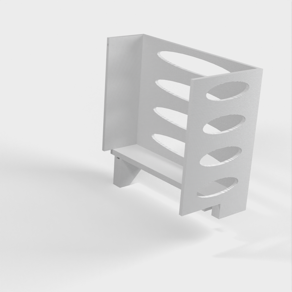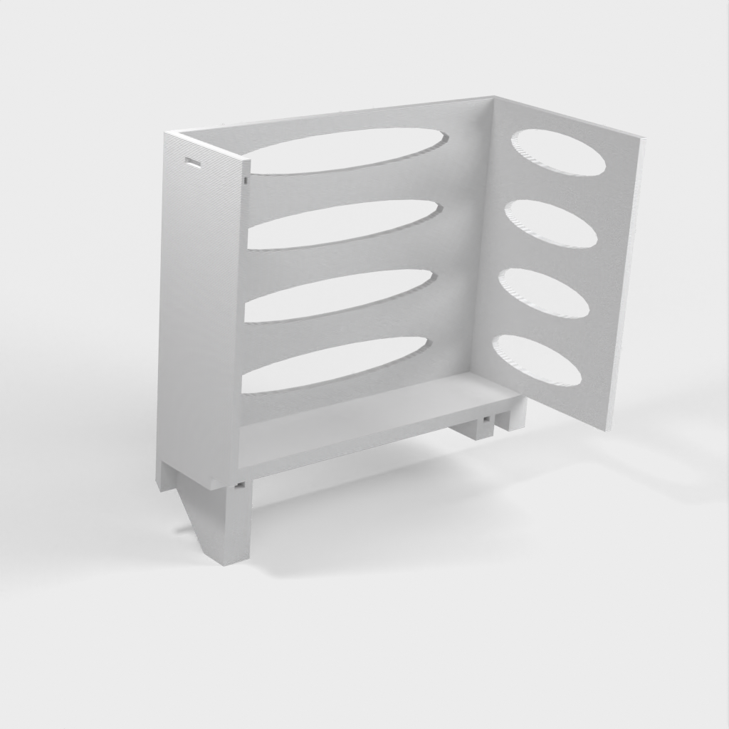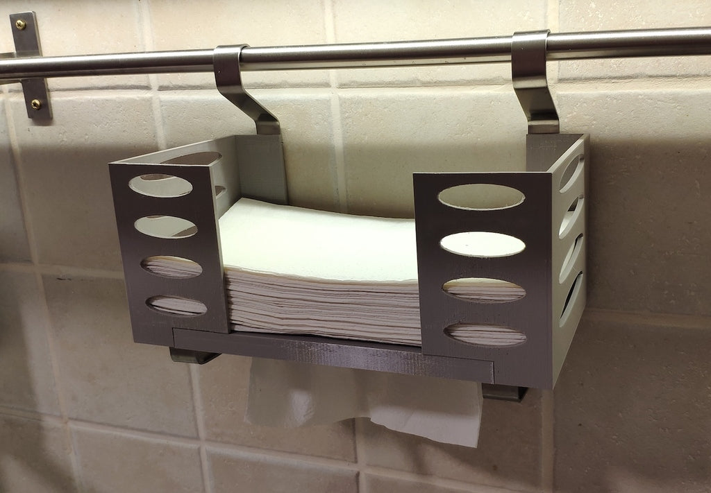 Questo distributore di asciugamani di carta può essere montato su una mensola Ikea Grundtal. Basta rimuovere il vassoio e posizionare gli elementi stampati sulle console. Il prodotto è dotato di aperture più piccole nella parte inferiore che possono essere utilizzate per fissare insieme gli elementi con un filo sottile. Ci sono anche aperture sul retro per il montaggio. Le dimensioni interne sono 130x 254 mm.