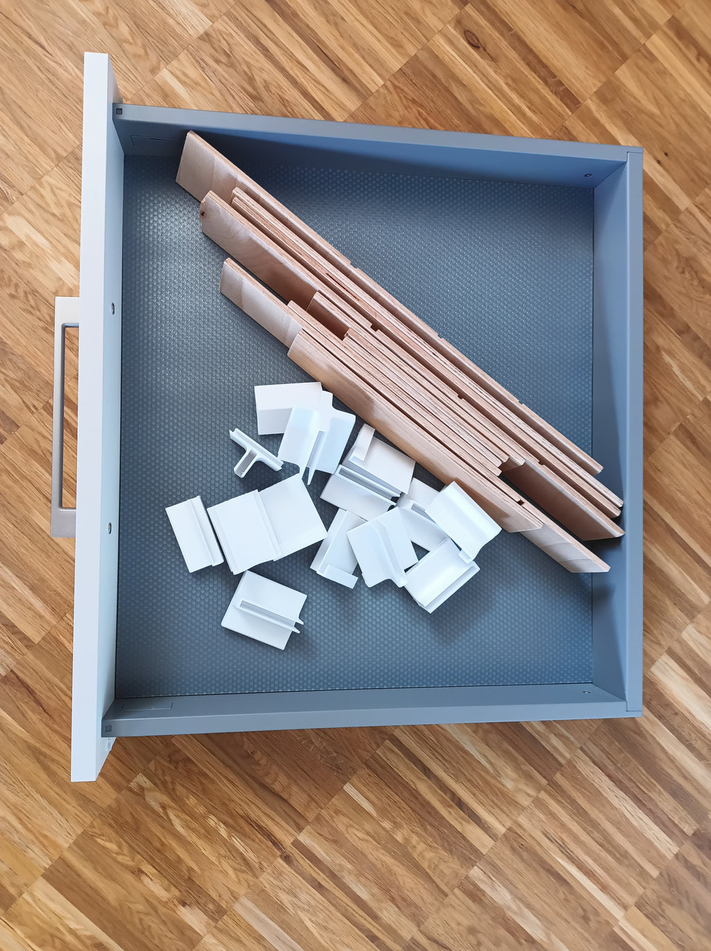 Con i pezzi stampati in 3D, puoi ottenere una vestibilità su misura, in modo che si adattino perfettamente alle tue esigenze. L'altezza della stecca (standard 63 mm) e lo spessore (standard 7 mm) assicurano che i divisori rimangano stabili e durevoli. Lo spessore delle pareti (2 mm) conferisce la resistenza e la forma desiderate. Puoi utilizzare una varietà di materiali per le stecche, come compensato di risulta, lastre acriliche o anche altri materiali che si adattano al tuo design.