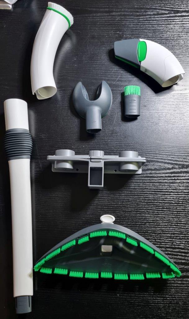 Questo è un supporto a parete progettato per il set di accessori dell'aspirapolvere Vorwerk Kobold. Vorwerk è noto per la creazione di dispositivi ben congegnati, ma non pensa a come riporre correttamente gli accessori. Questo supporto a parete risolve il problema.