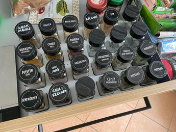Organizza le tue spezie con questo pratico organizzatore per barattoli di spezie progettato per cassetti. Offre un modo efficace per mantenere le tue spezie in ordine e facilmente accessibili. Questa variante è ideale per barattoli di spezie rettangolari, ma può anche essere adattata a barattoli di spezie rotondi, rendendola flessibile per diverse esigenze di stoccaggio.