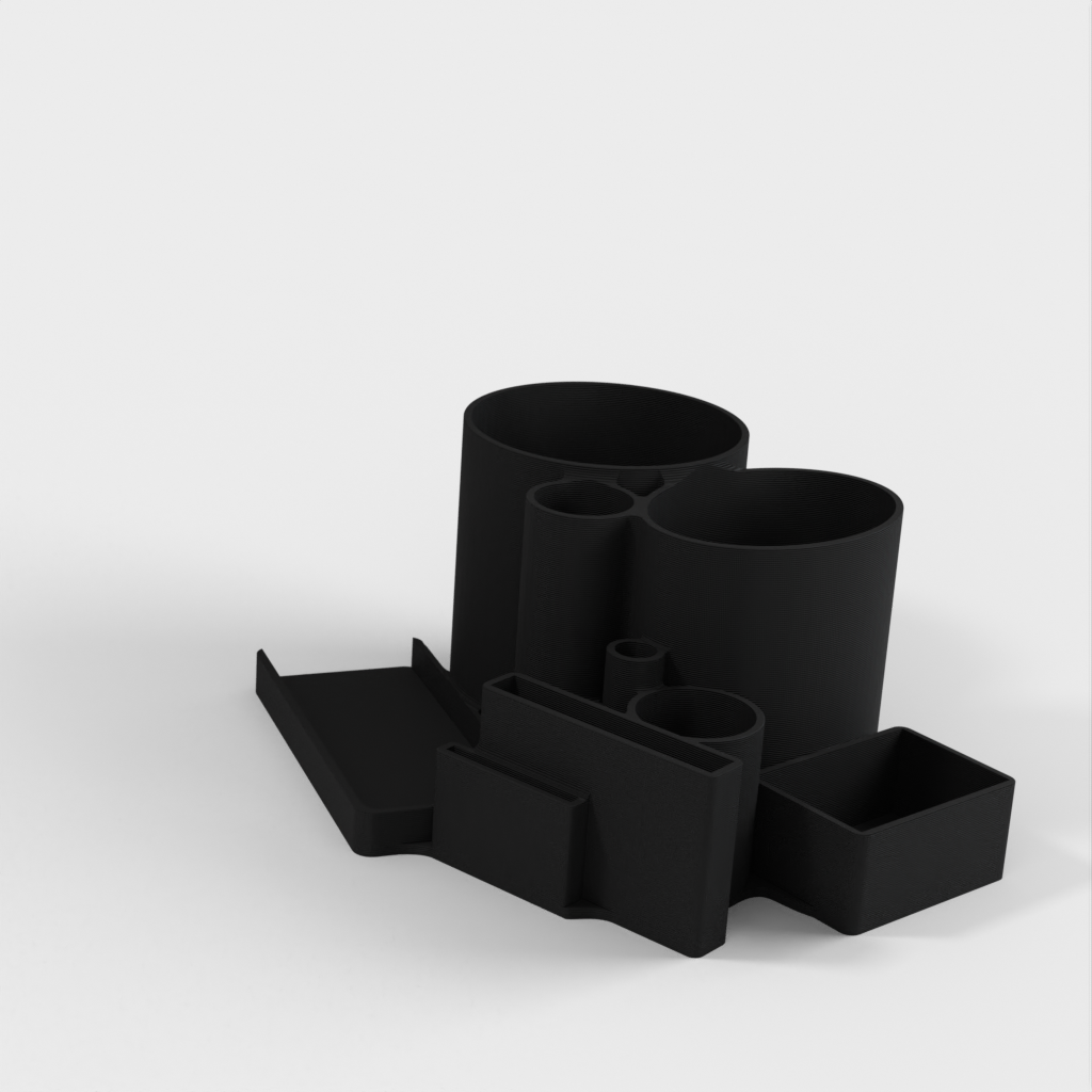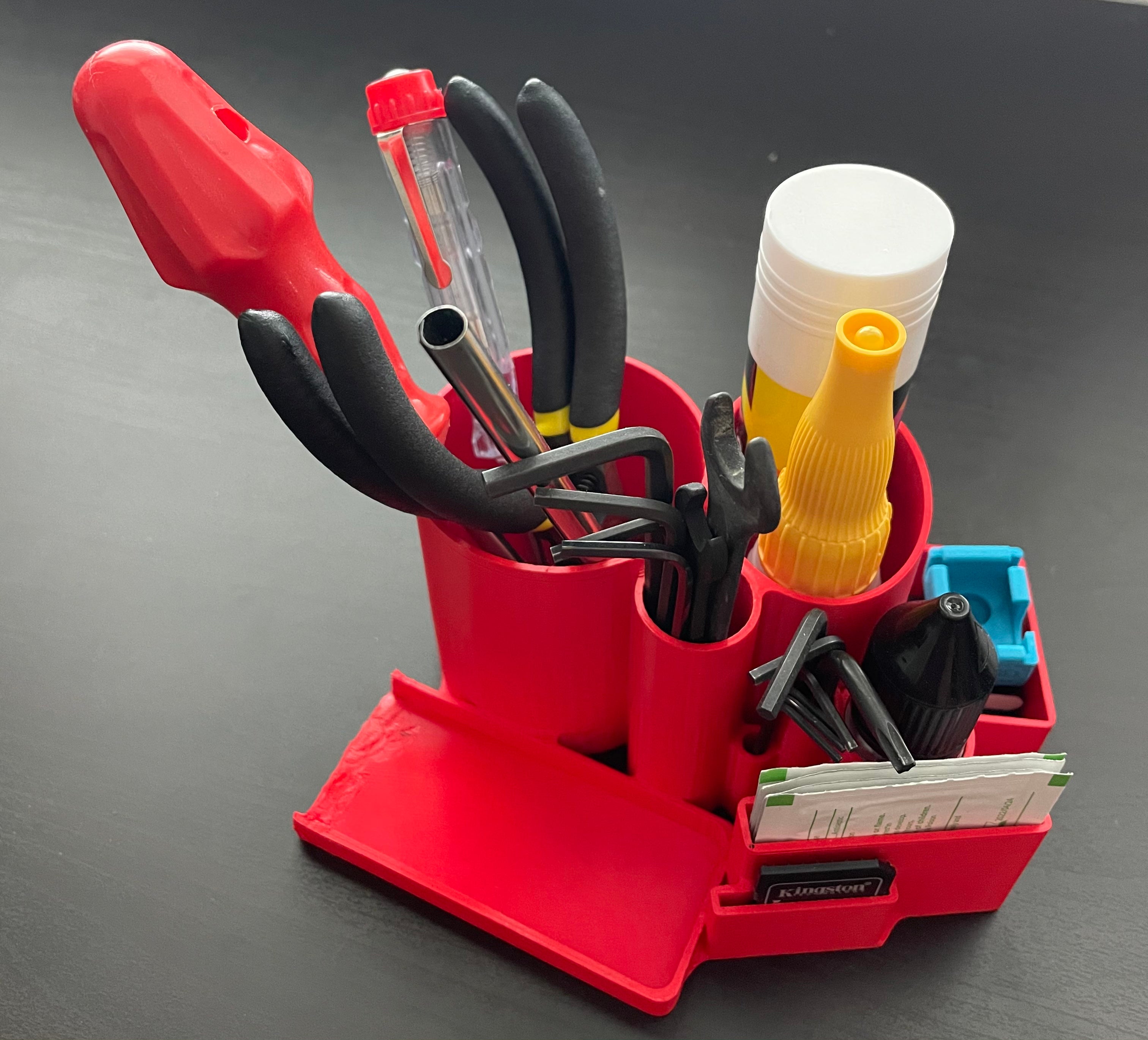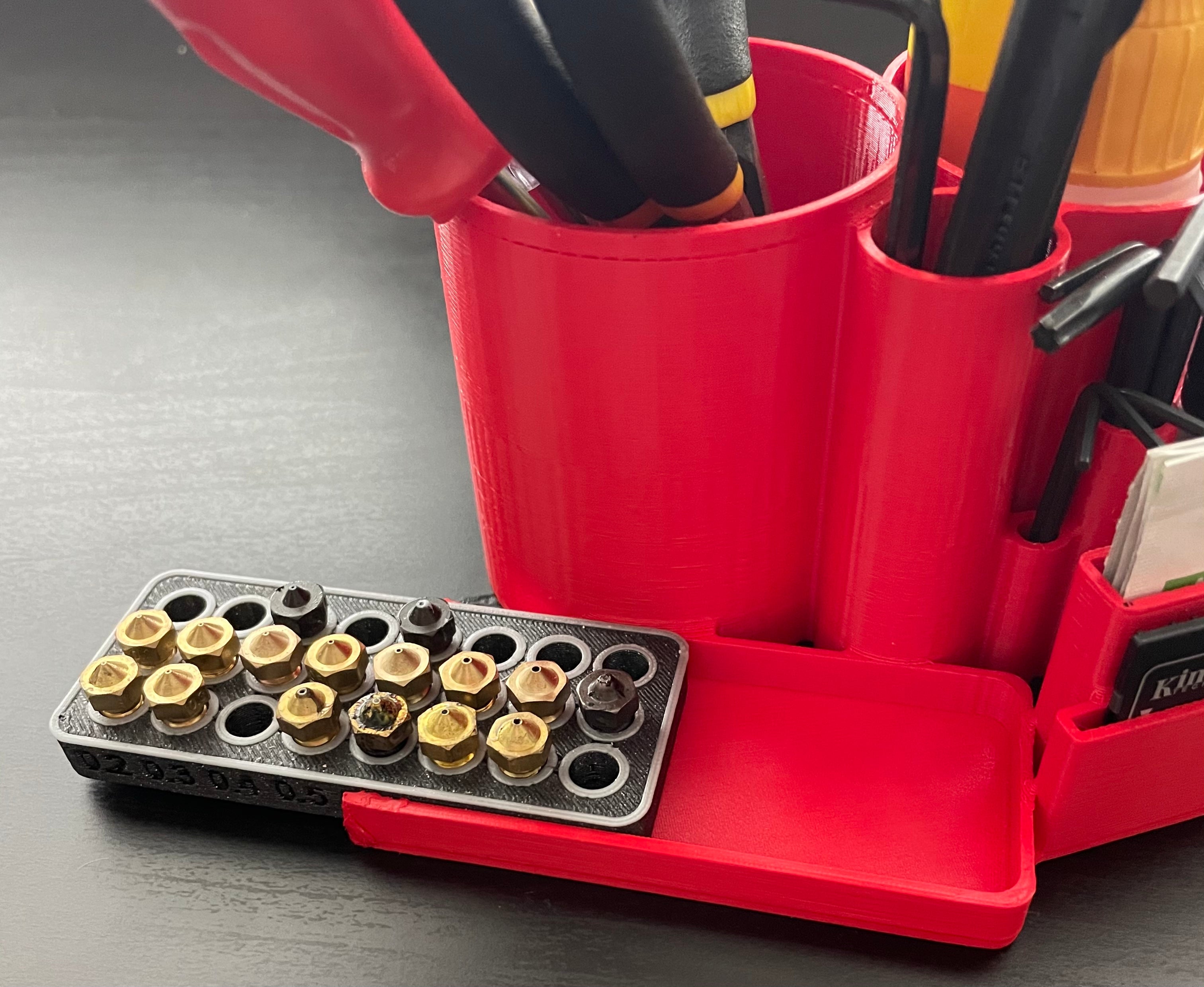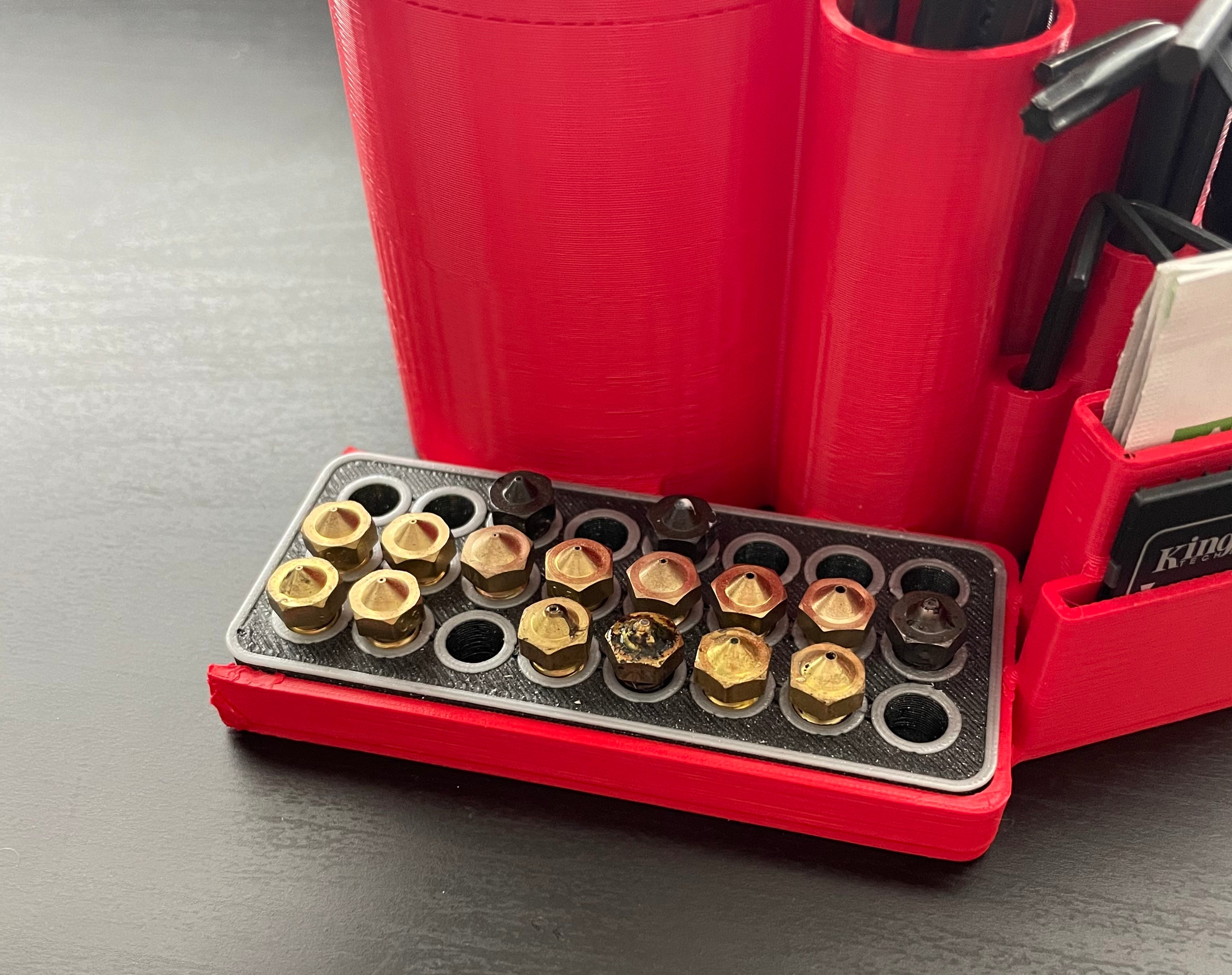 Un portautensili e un organizzatore che ho progettato per riporre tutti i miei attrezzi. Si adatta comodamente alla stampante. È compatibile con questo portaugelli: https://www.prusaprinters.org/prints/57441-nozzle-organizer. Strumenti come ugelli, pennelli, colla, pinze, cacciaviti, chiavi a brugola, schede microSD, schede SD e stracci possono essere riposti in questo supporto. Consente di riporre e accedere agli strumenti necessari in modo facile e ordinato.