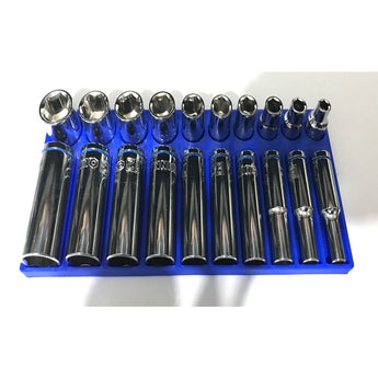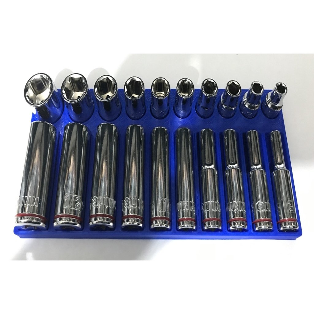 Questi organizer per bussole da 1/4" sono progettati per migliorare l'organizzazione nella tua cassetta degli attrezzi sia per le misure metriche che SAE. Aiutano a mantenere le tue bussole sistematicamente riposte, rendendole più facili da trovare e accedere durante il lavoro. Il design supporta sia le bussole standard che quelle profonde.
