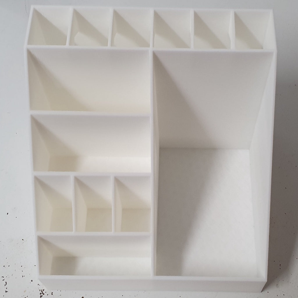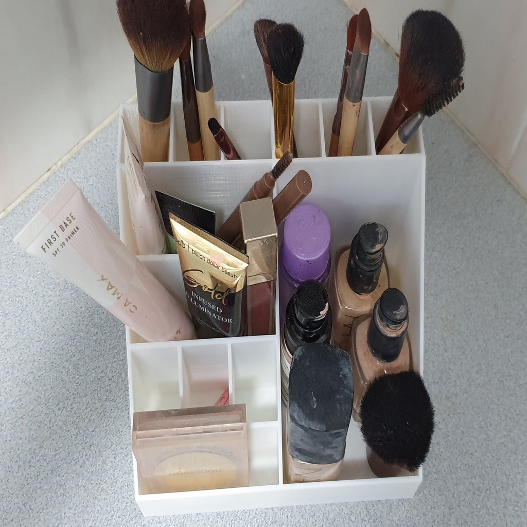 Un pratico porta trucchi con divisori che semplifica l'organizzazione dei pennelli e delle altre attrezzature per il trucco. Questo supporto ti aiuterà a mantenere la tua scrivania o il mobile del bagno ordinato e pulito, mentre i tuoi prodotti sono sempre a portata di mano. Un'aggiunta perfetta alla tua casa!