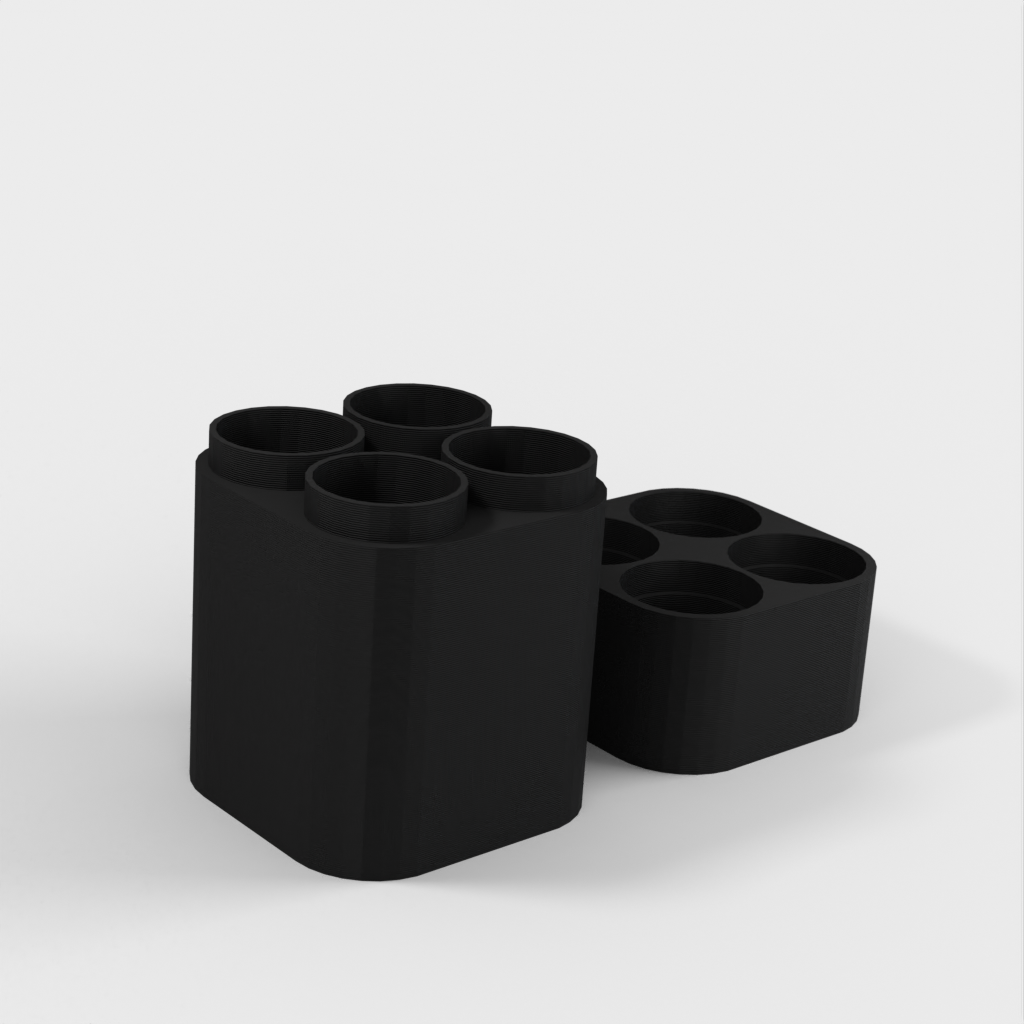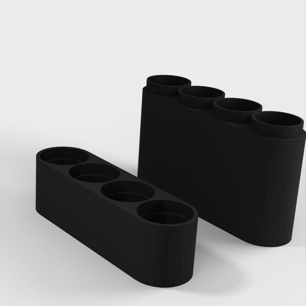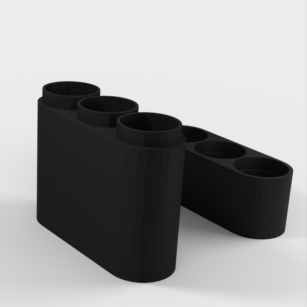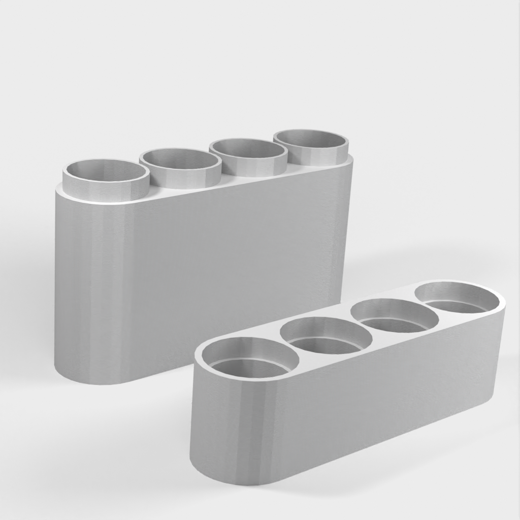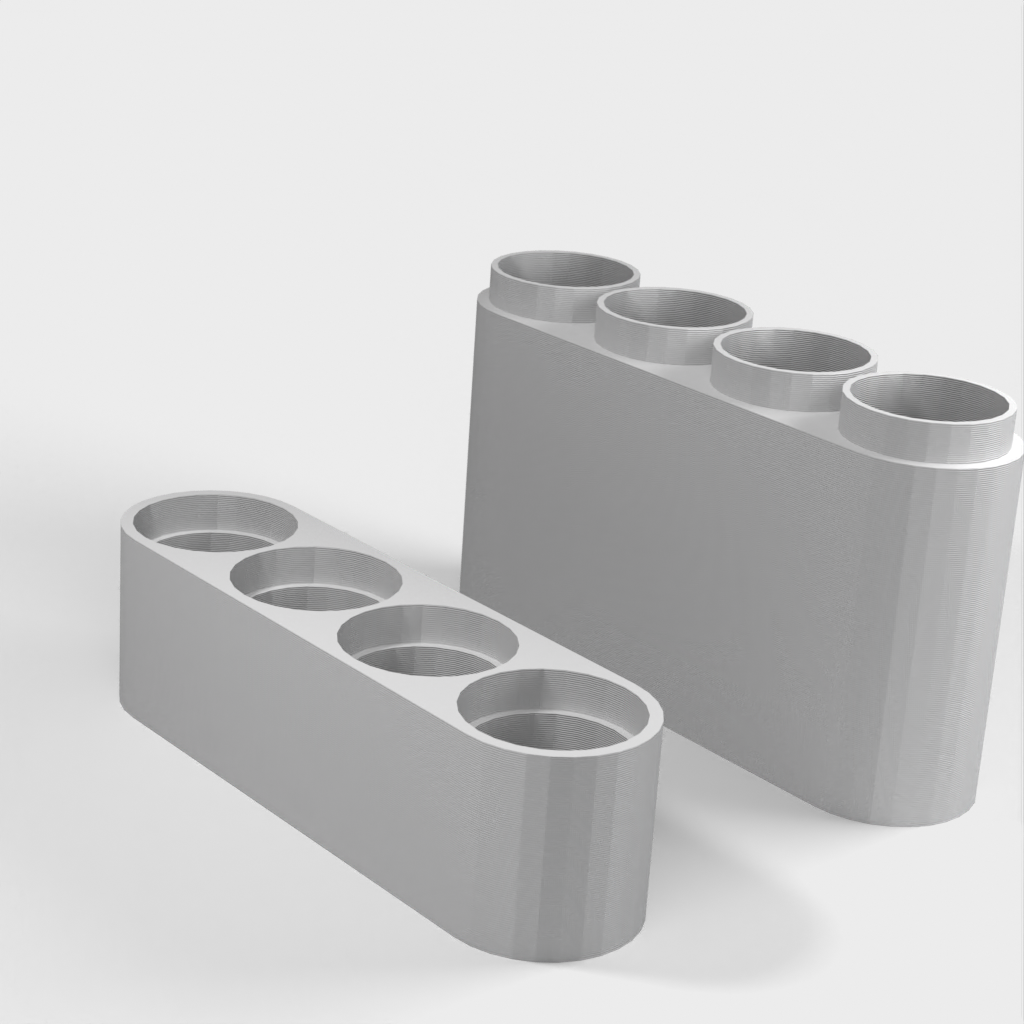 Il supporto da viaggio per batterie AA e AAA aiuta a organizzare le batterie in modo efficiente. Questo supporto può contenere 2, 4 o 3 pile, in una matrice lineare o 2x2. Il supporto è composto da un pezzo superiore e uno inferiore e utilizza una semplice regola empirica: Se la piccola rientranza è rivolta verso l'alto, la batteria è carica.