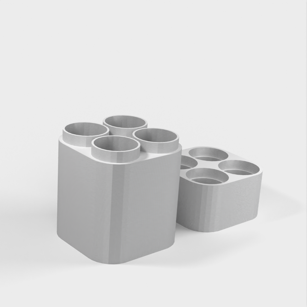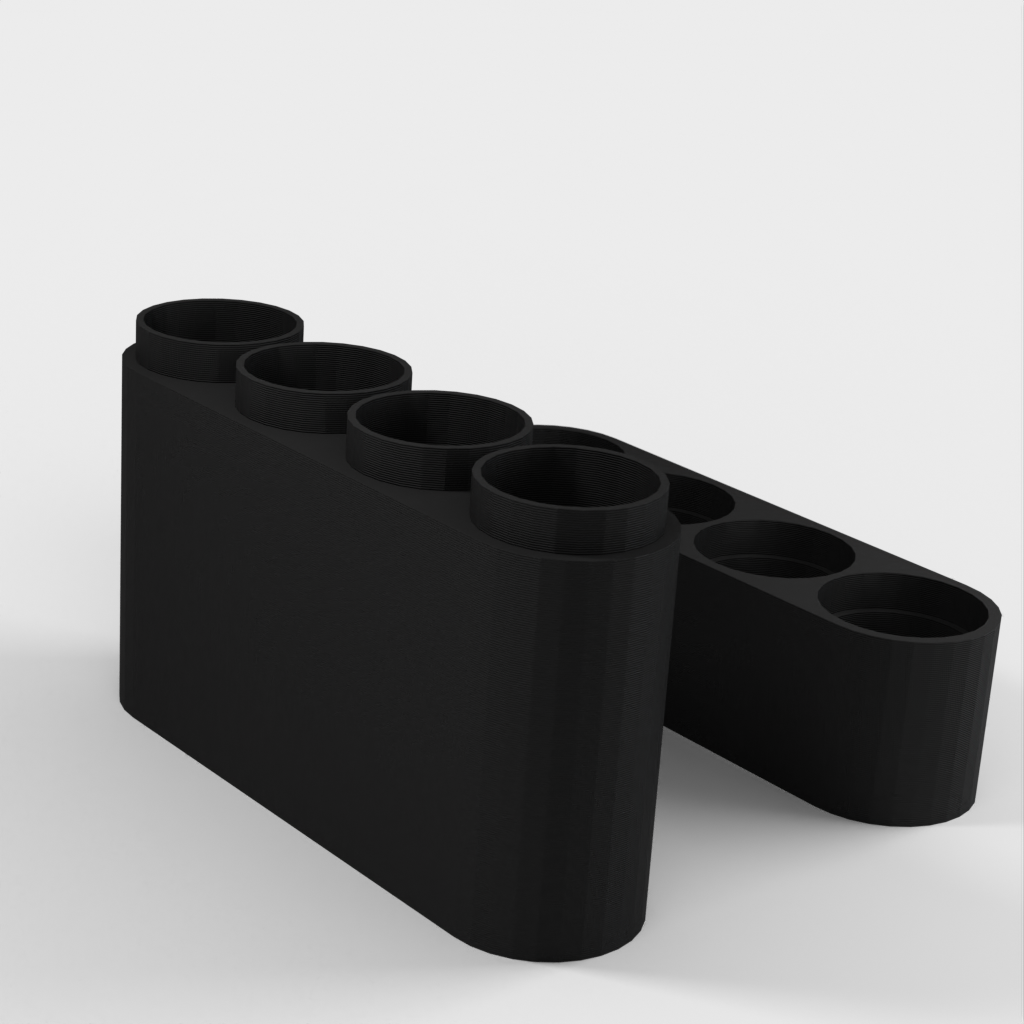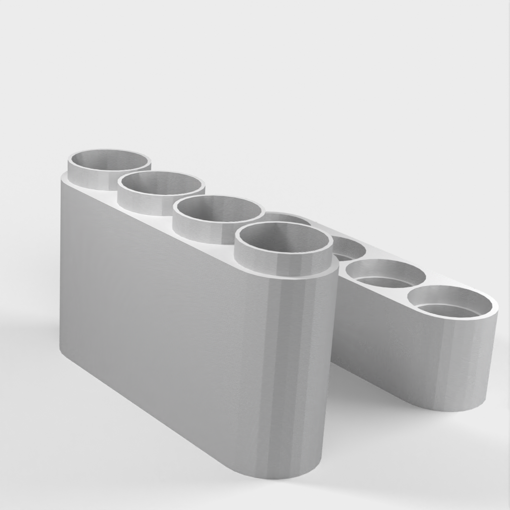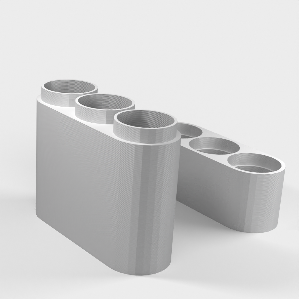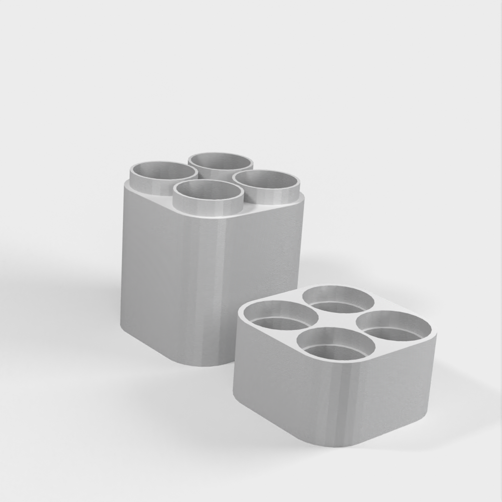 Il supporto da viaggio per batterie AA e AAA aiuta a organizzare le batterie in modo efficiente. Questo supporto può contenere 2, 4 o 3 pile, in una matrice lineare o 2x2. Il supporto è composto da un pezzo superiore e uno inferiore e utilizza una semplice regola empirica: Se la piccola rientranza è rivolta verso l'alto, la batteria è carica.