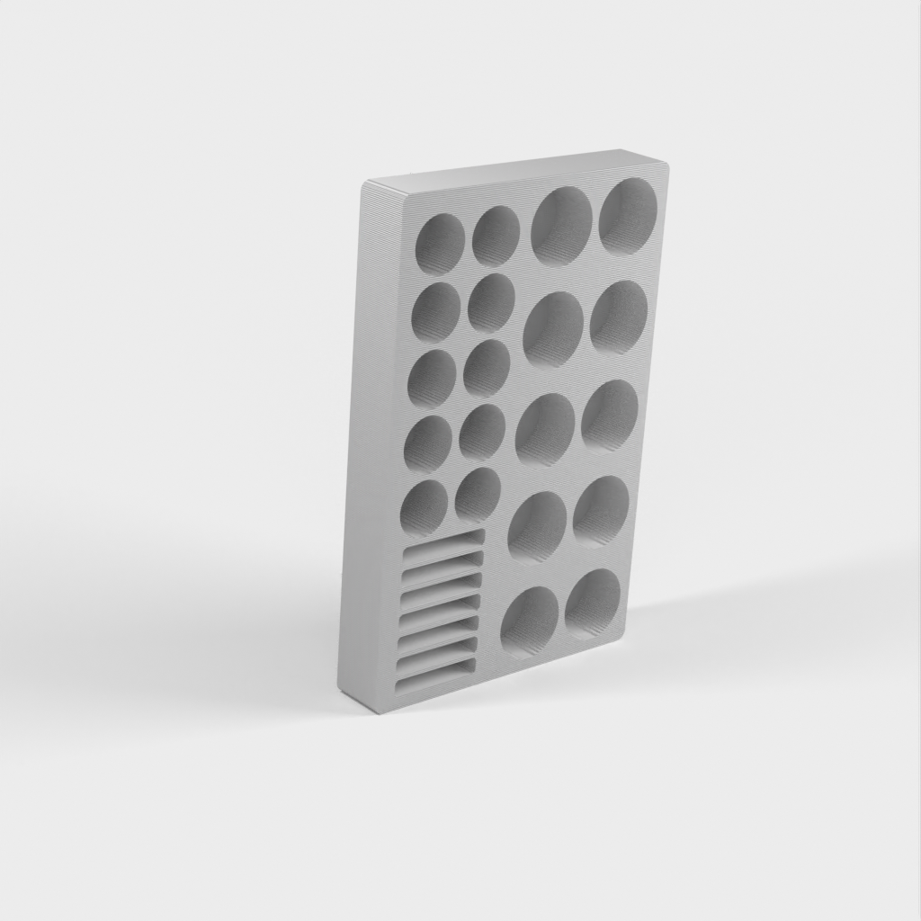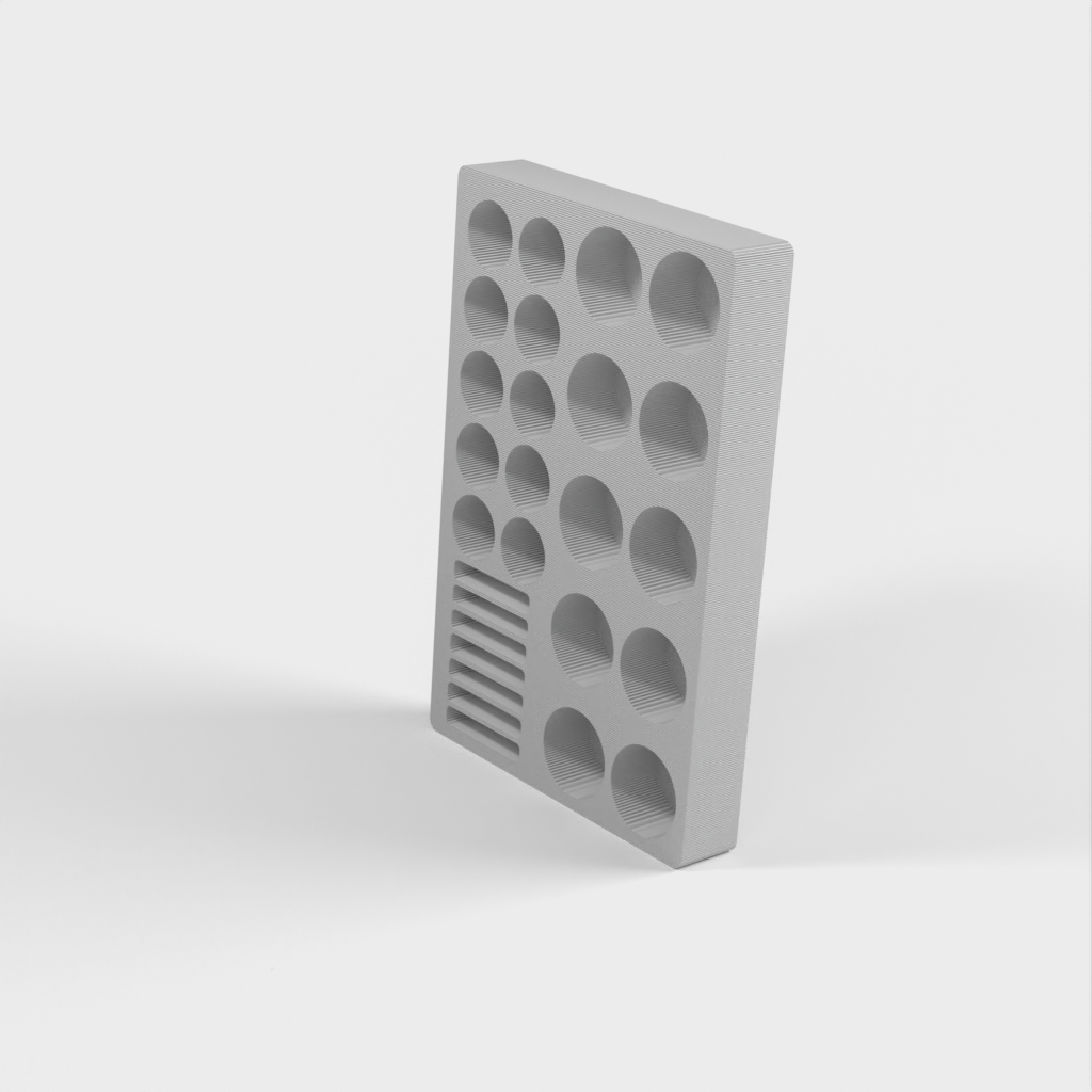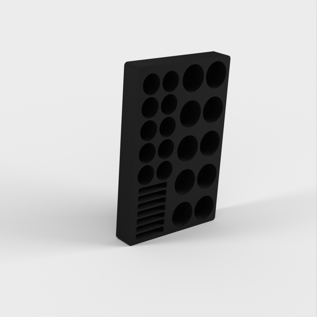 Portabatterie specifico per batterie AA, AAA e CR2032. È stato progettato specificamente per le batterie IKEA Ladda, ma si adatta anche ad altre marche, purché non siano più sottili delle batterie di dimensioni normali. Il supporto può contenere 10 batterie AA, 10 AAA e 7 CR2032. Questo aiuta a mantenere le batterie organizzate e facilmente accessibili.
