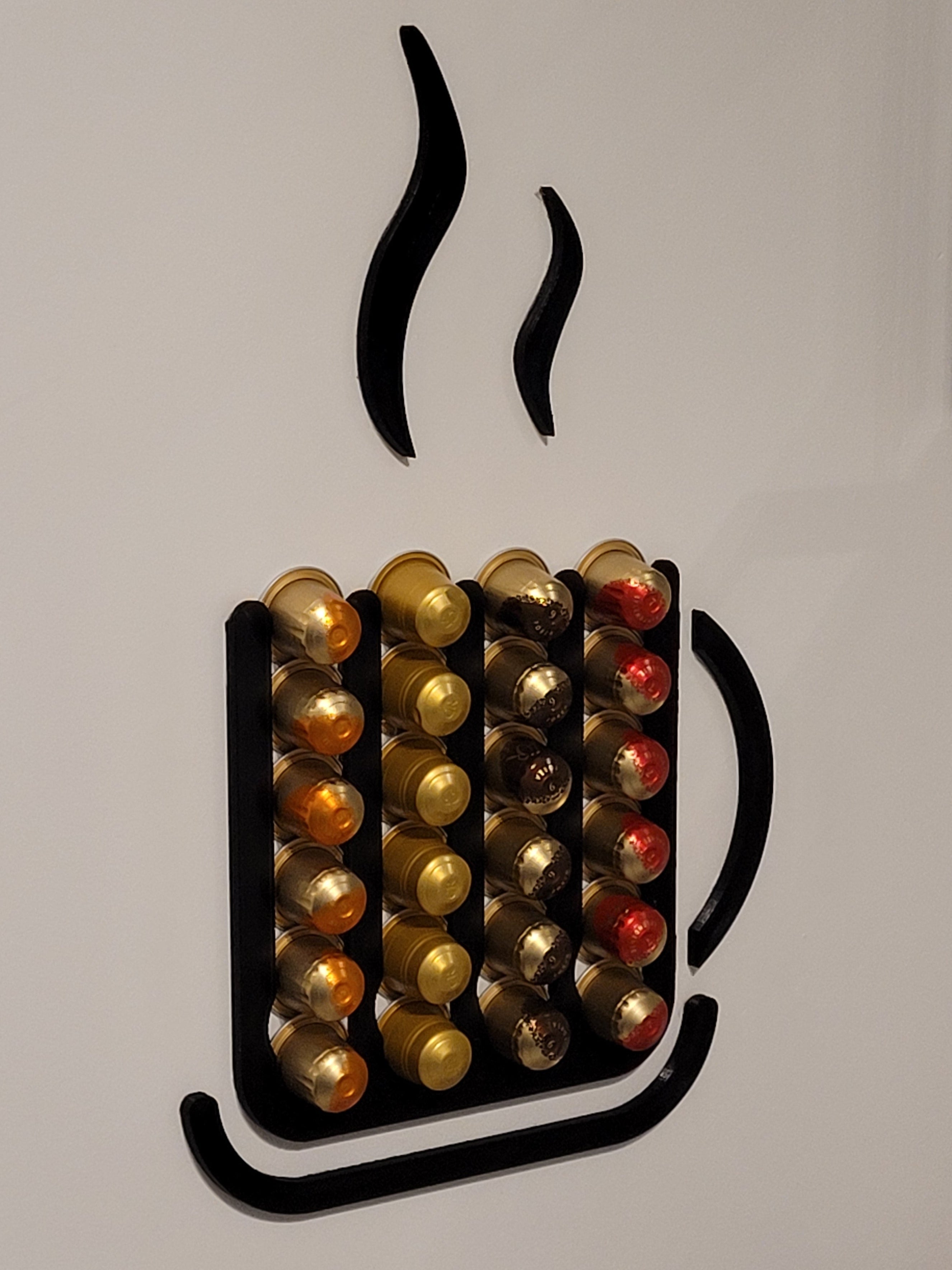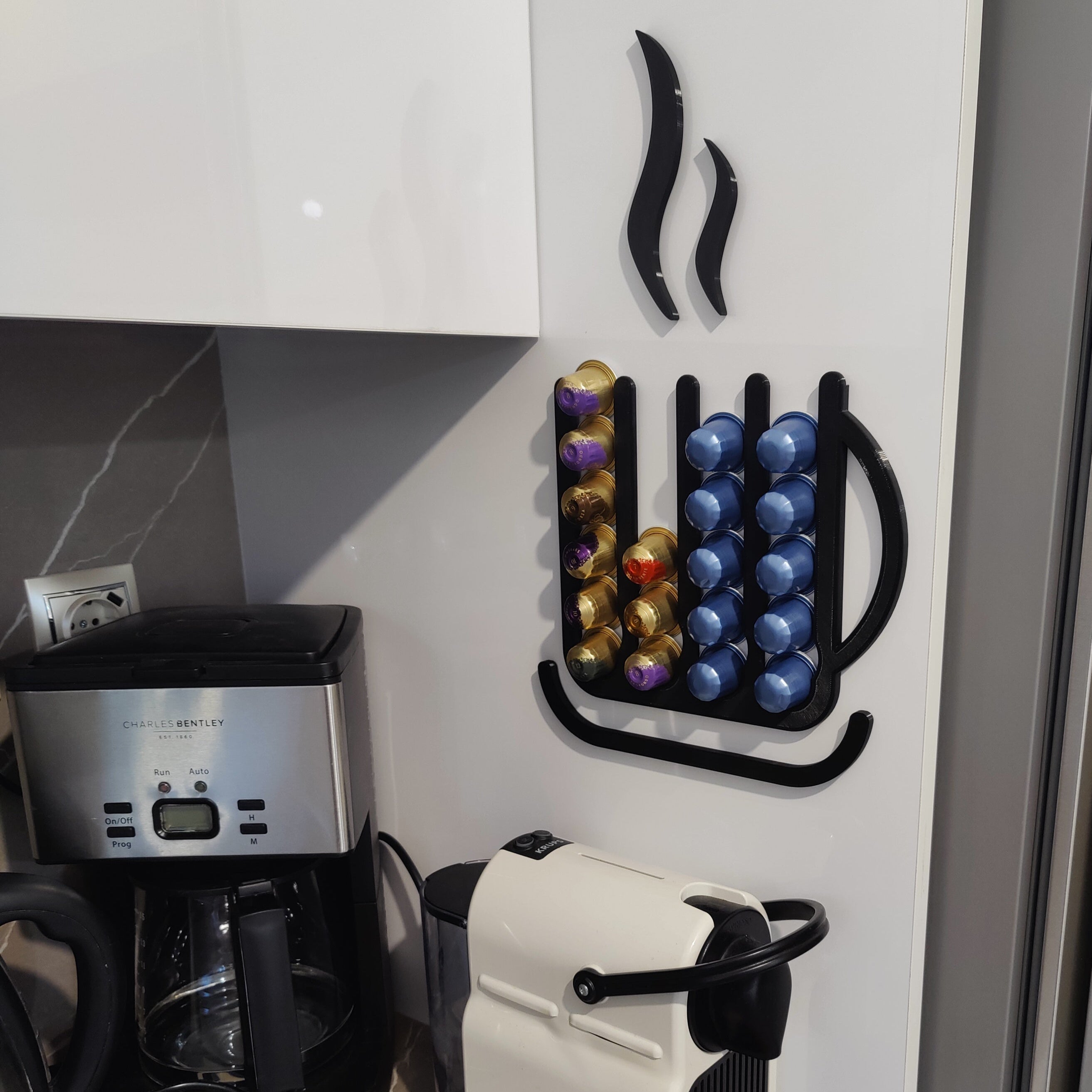 Questo è un dispenser per capsule Nespresso; a forma di tazza e progettato per essere appeso alla parete.