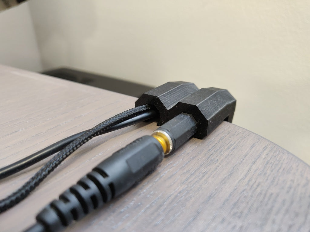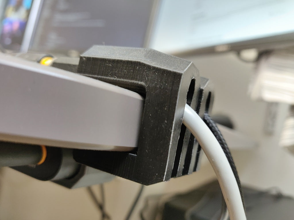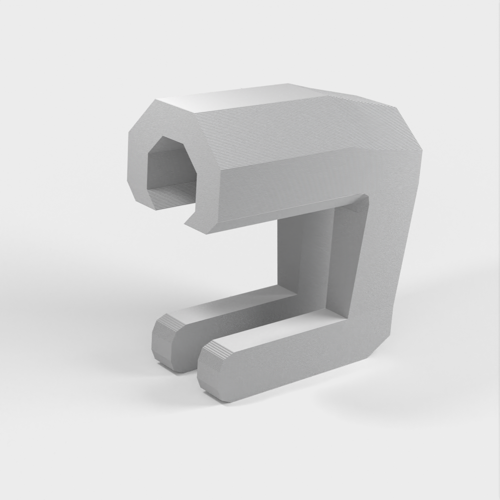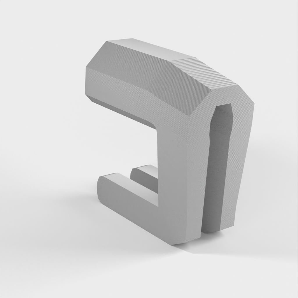 Un semplice portacavi, progettato per adattarsi al tavolo IKEA BEKANT. Questo supporto aiuta a gestire i cavi delle cuffie, del mouse e della tastiera, mantenendoli al sicuro e organizzati. Perfetto per qualsiasi ambiente domestico o d'ufficio in cui i cavi possono sporcarsi o cadere sul pavimento. Questo prodotto è destinato a tavoli con uno spessore di 1,6 cm.