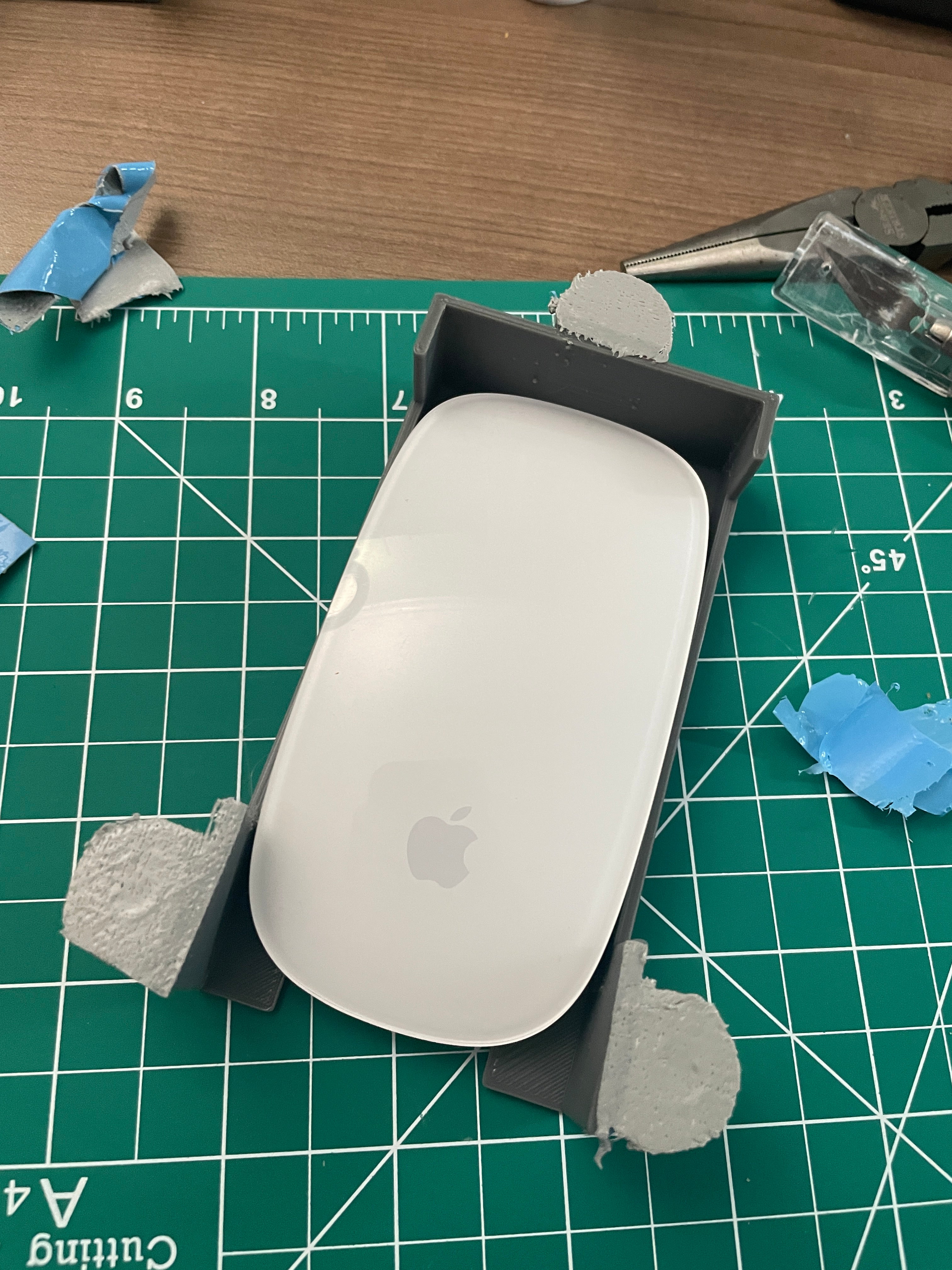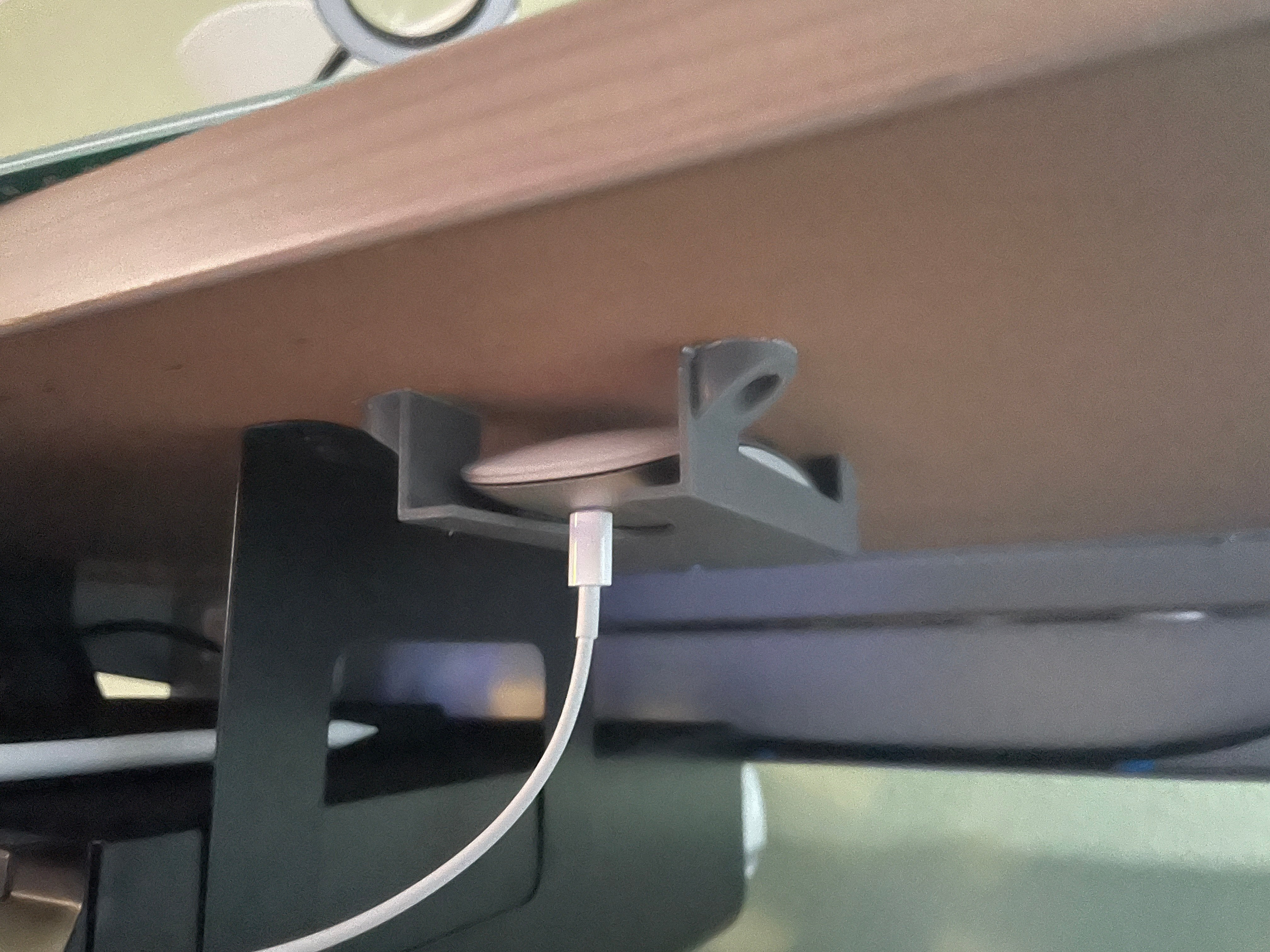 Il supporto per Magic Mouse sotto la scrivania è una soluzione pratica e organizzata per riporre il Magic Mouse. Si monta facilmente sotto la scrivania utilizzando nastro biadesivo o viti. Il design include un foro nella parte inferiore che consente di ricaricare il mouse mentre si trova nel supporto, assicurando che il mouse sia sempre pronto all'uso.