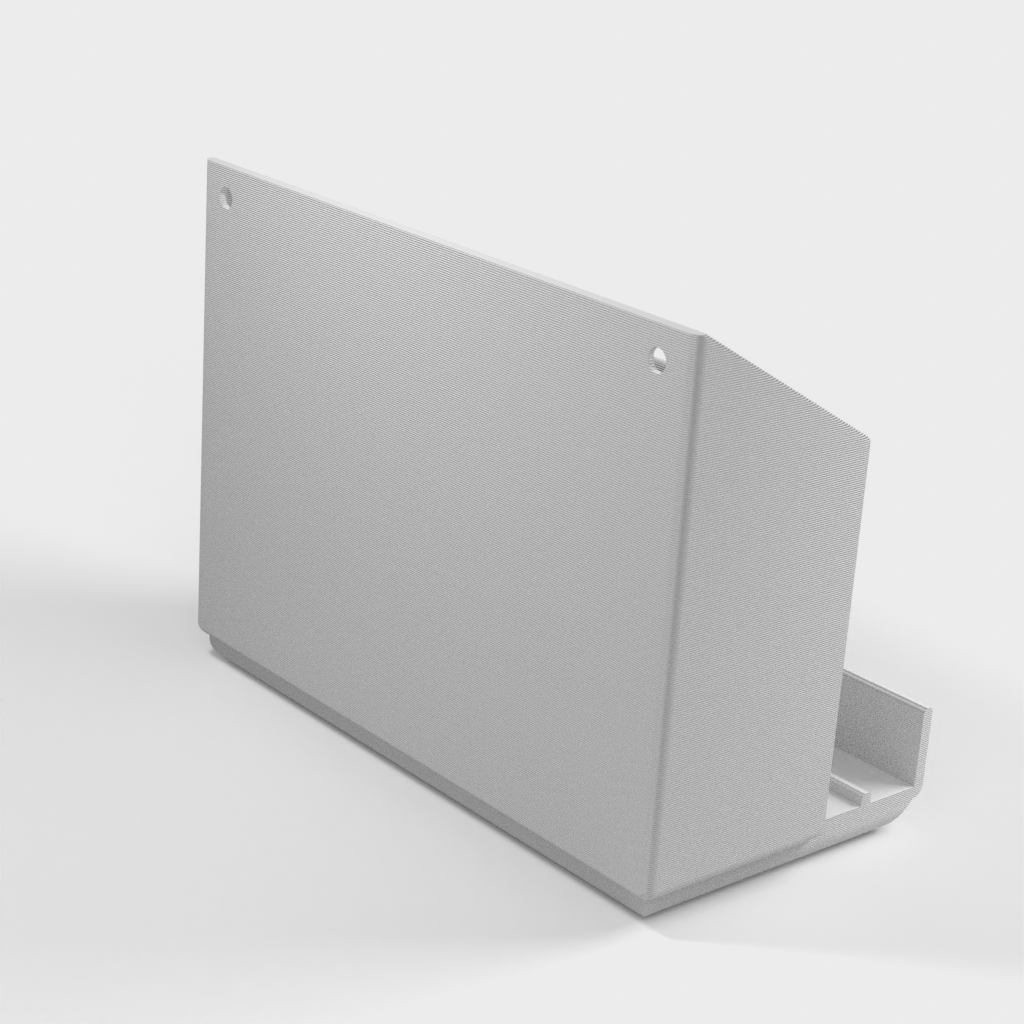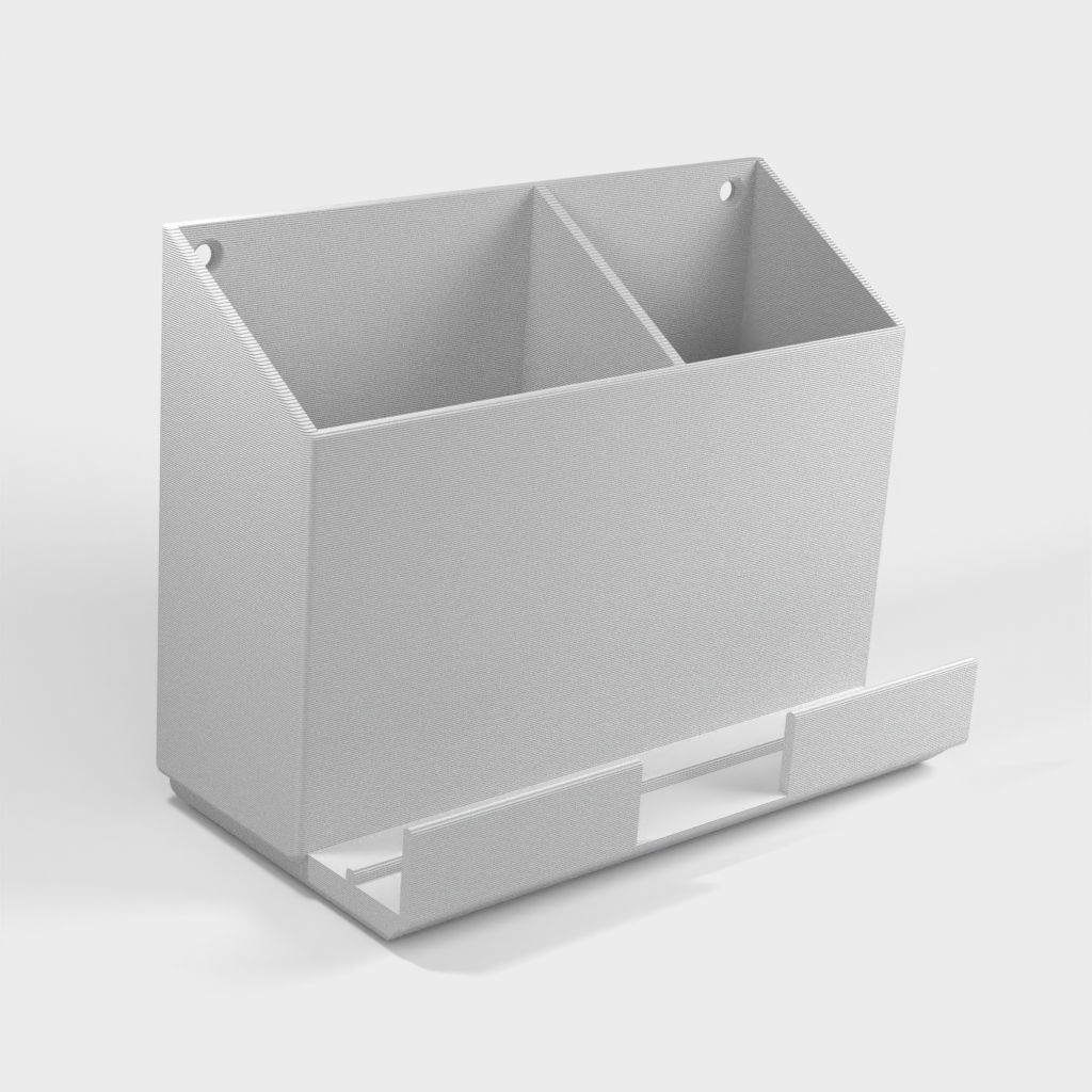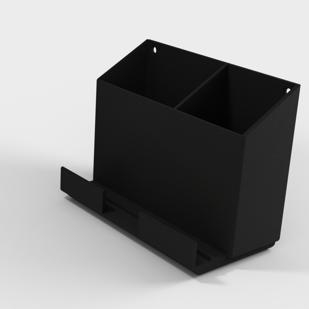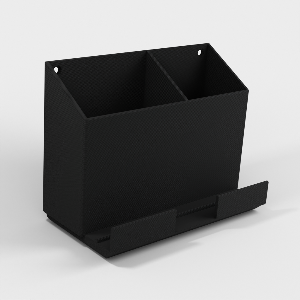 Supporto a parete per telecomando con spazio per due telecomandi e un telefono cellulare. Il supporto più grande è ideale per i controller AC e quello più piccolo è perfetto per i controller TV. Il prodotto offre anche un pratico supporto sulla parte anteriore per il telefono. Inoltre, questo prodotto include un file Freecad, che semplifica la modifica della posizione della linea di divisione o la sua rimozione completa.