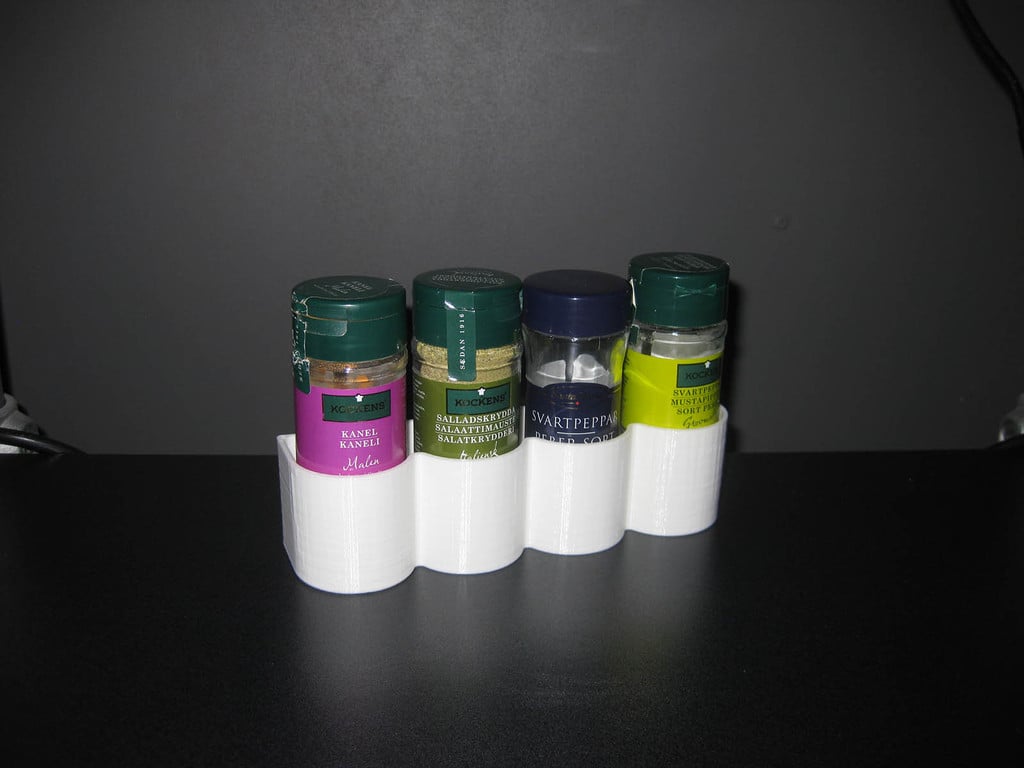 Un semplice supporto per quattro barattoli di spezie. Alto 42 mm e largo 183 mm, con un diametro massimo dei vasetti di 43 mm. Con questo supporto potrete conservare facilmente le vostre spezie e creare un ambiente ordinato in cucina.