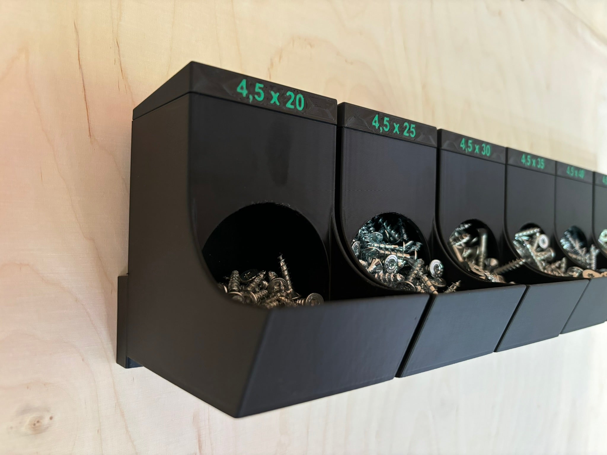 Il design è semplice da stampare, e tutte le parti possono essere stampate senza materiale di supporto, ad eccezione dei coperchi. Puoi aggiungere testo o etichette per creare una soluzione di stoccaggio personalizzata che si adatti alle tue esigenze specifiche. I materiali possono variare, ma PETG e PLA danno buoni risultati. Con questo Vaso per Viti puoi facilmente organizzare e accedere alle tue viti o attrezzi, risparmiando così tempo e confusione nel tuo lavoro quotidiano.