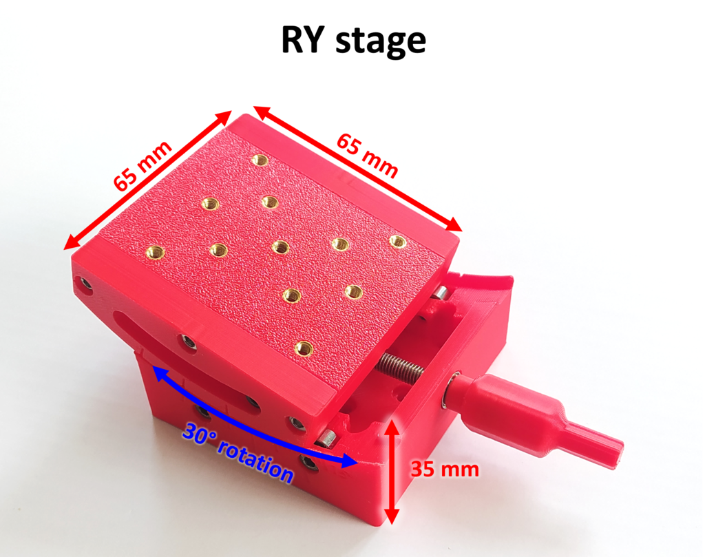 Il palcoscenico goniometrico stampato è un dispositivo meccanico avanzato progettato per una posizione precisa con un'accuratezza fino a 10 micrometri. Questo palcoscenico utilizza sia parti stampate in 3D sia cuscinetti a sfera di alta prestazione, inclusi 8 693ZZ e MR95-ZZ, per un design ottimale del movimento.