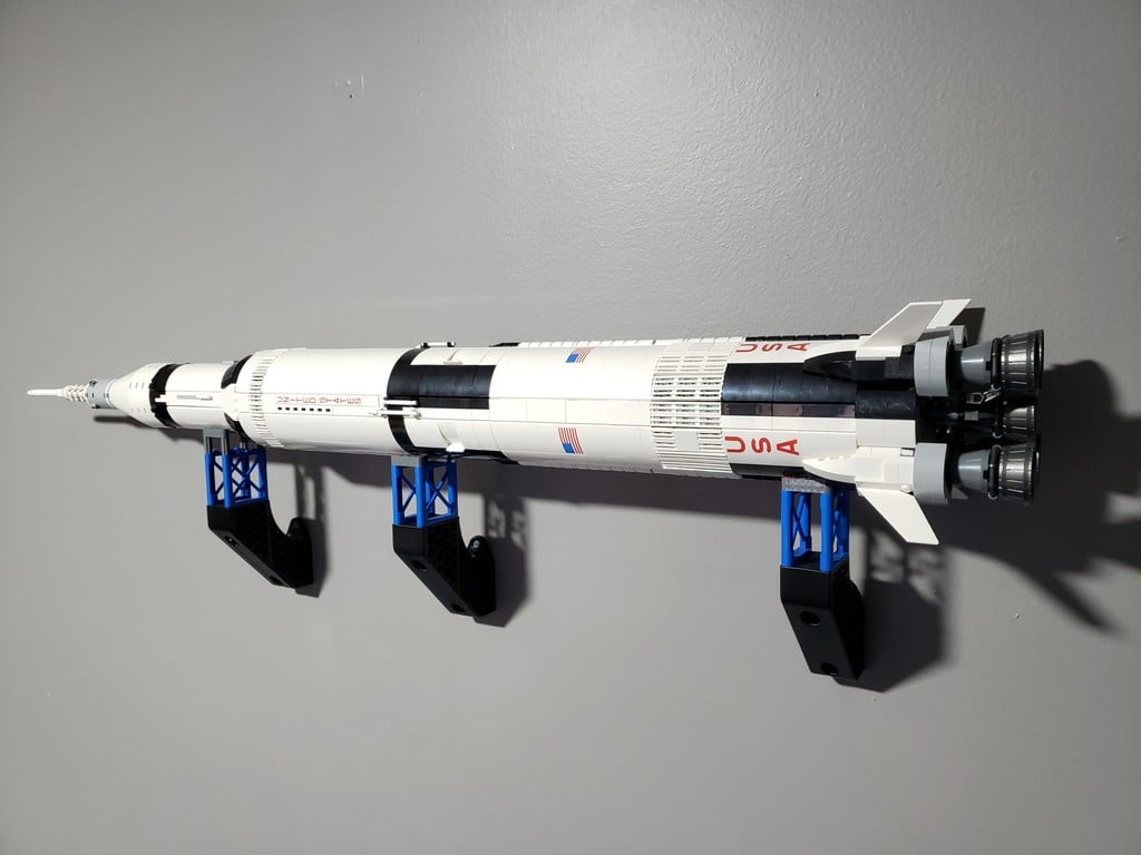 Supporto a parete per il modello Lego Saturn V. Ha funzioni per contenere gli assi Lego che collegano il supporto blu fornito con il modello. Perfetto per esporre il tuo modello Lego Saturn V sulla parete.