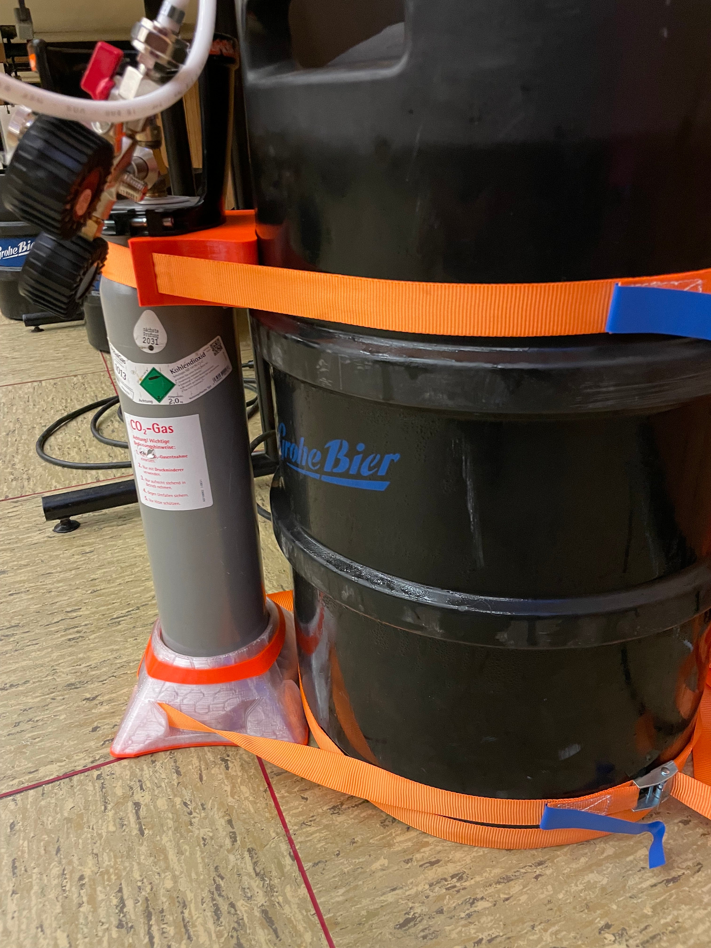 È stato sviluppato specificamente per bombole di CO2 da 2 litri e si adatta perfettamente sia a fusti di birra da 30 litri che da 50 litri. Con un diametro di apertura di circa 10,5 cm si ottiene una vestibilità aderente e stabile. Per maggiore sicurezza, la bombola può essere facilmente fissata con cinghie larghe fino a 25 mm, eliminando il rischio di ribaltamento.