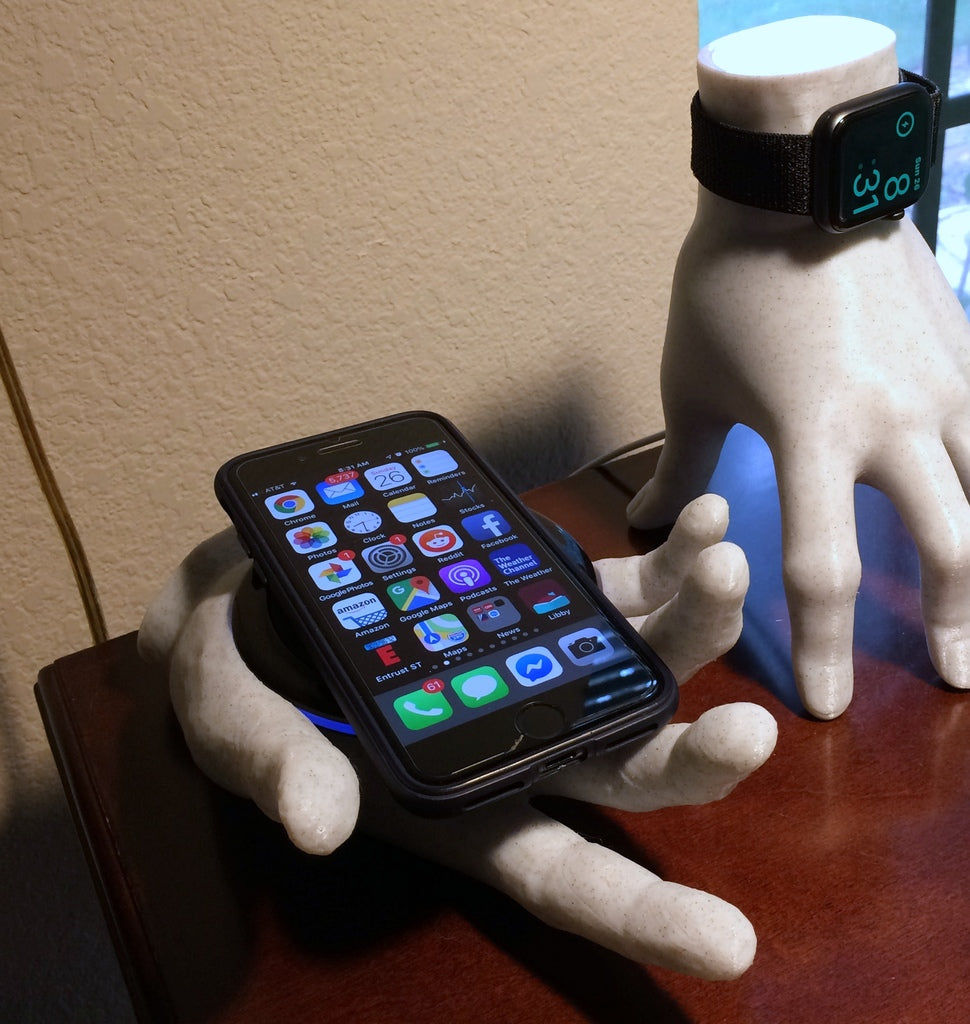 C'è spazio per un caricabatterie wireless all'interno della mano stessa. L'intaglio è fatto per adattarsi a un opalder wireless a forma di cerchio con un diametro massimo di 94 mm.