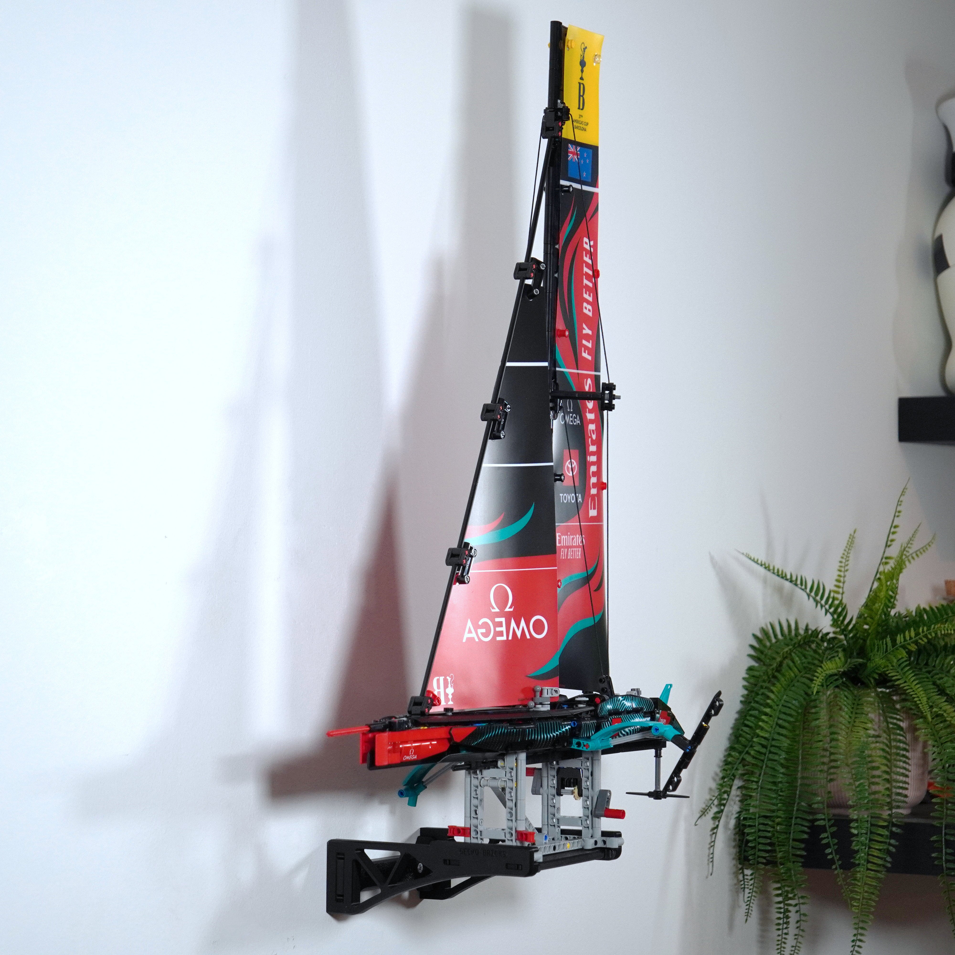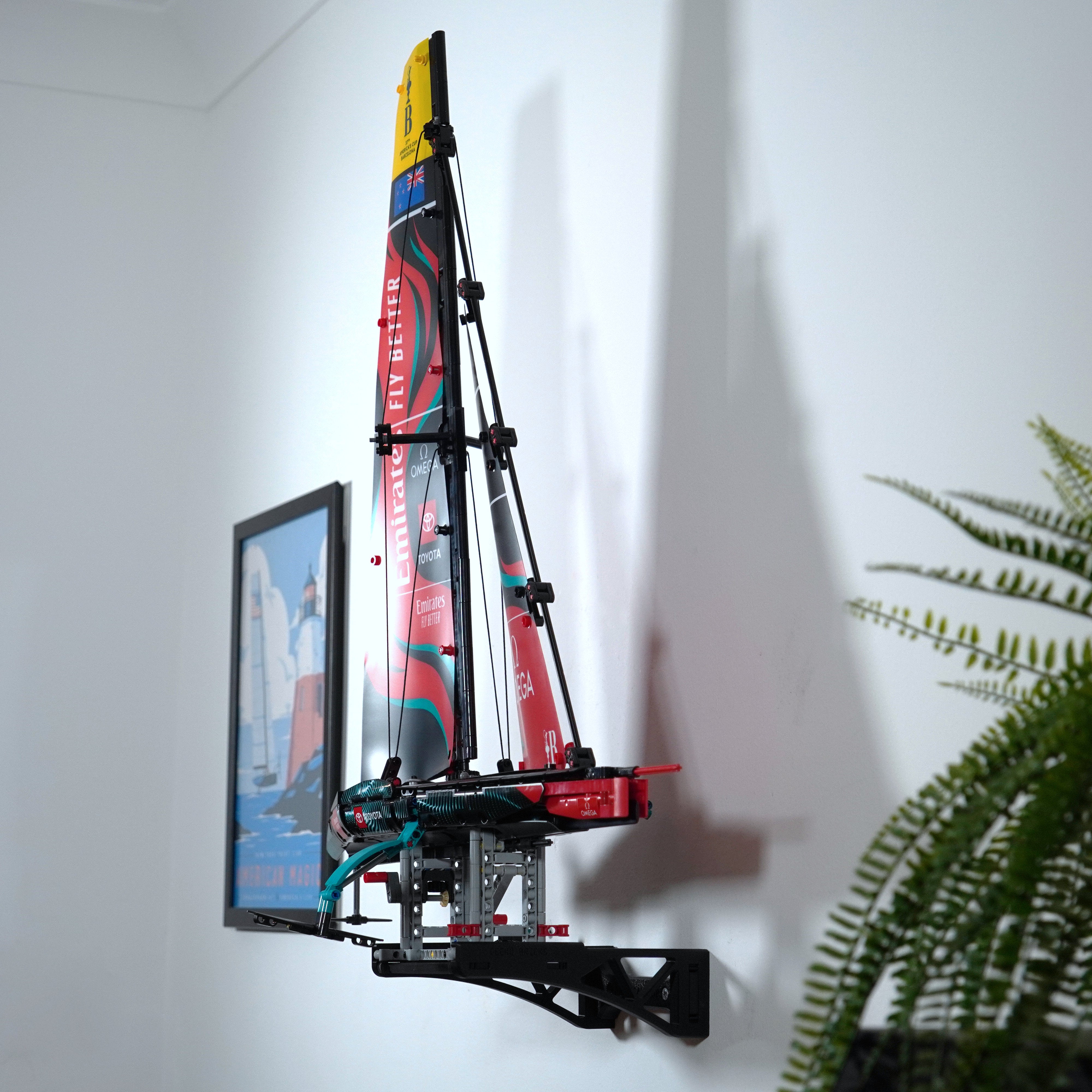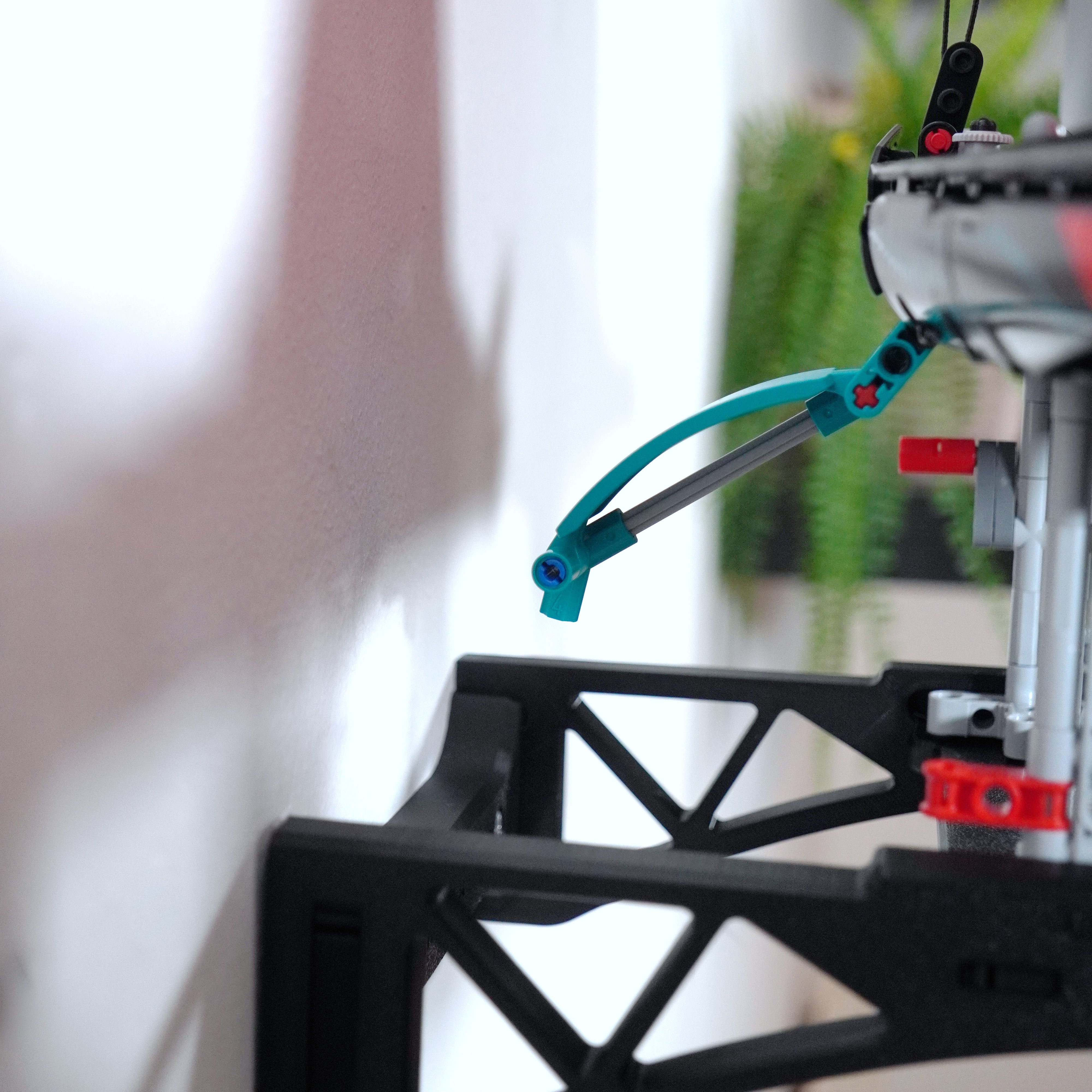 Dette vægophæng sikrer en stabil udstilling af din Technic Emirates New Zealand AC75 Yacht på væggen. Modellen kan monteres vendt mod enten højre eller venstre, og designet giver mulighed for at betjene de pneumatiske foil-arme. Den aftagelige del kan praktisk opbevares direkte i selve beslaget.