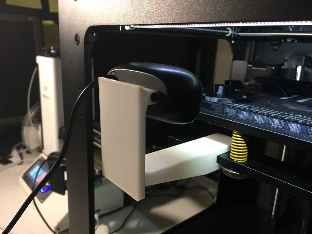 Il supporto riutilizza la base in plastica e la vite esistenti della fotocamera Logitech C270, rendendo l'installazione semplice. Scivola senza sforzo e si fissa saldamente al telaio della stampante appena sotto il piano di costruzione. Per ottenere l'immagine più nitida, si consiglia di regolare la messa a fuoco manuale della fotocamera in modo che corrisponda alla distanza dall'area di stampa.